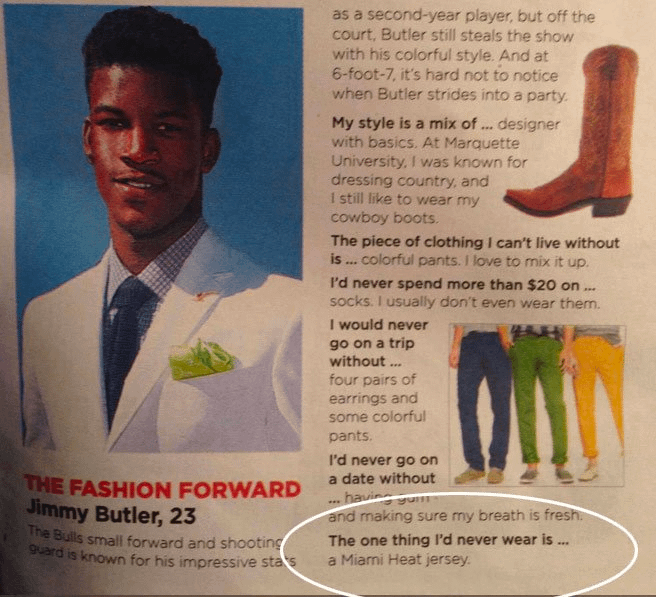 Por cierto, una curiosidad sobre su perfil después de ser elegido en el Draft, donde decía que la única cosa que no vestiría nunca es UNA CAMISETA DE LOS MIAMI HEAT.
