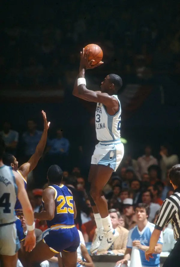 Si en aquel momento hubiéramos bajado la vista a la altura del parqué, y nos fijásemos en las zapatillas de aquellos chicos, podríamos observar algo curioso... TODOS llevaban zapatillas Converse, pues la Universidad de Carolina del Norte tenía un acuerdo con esta marca.