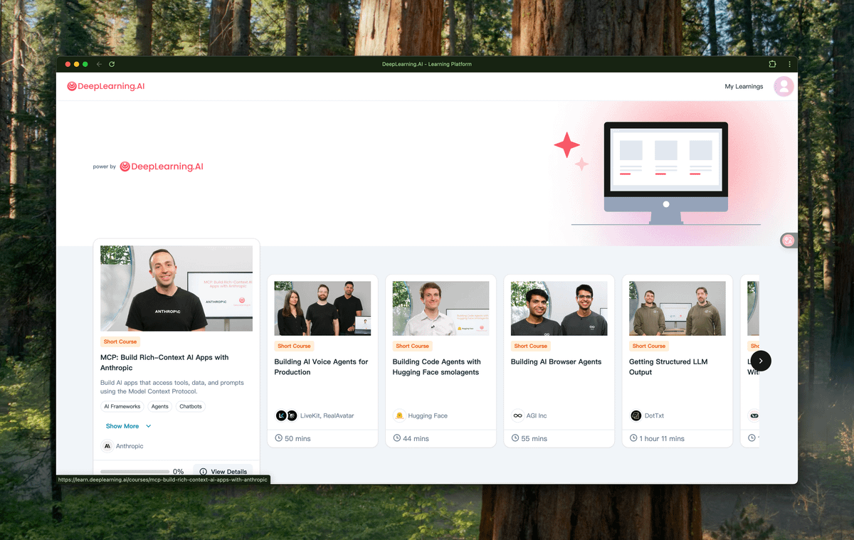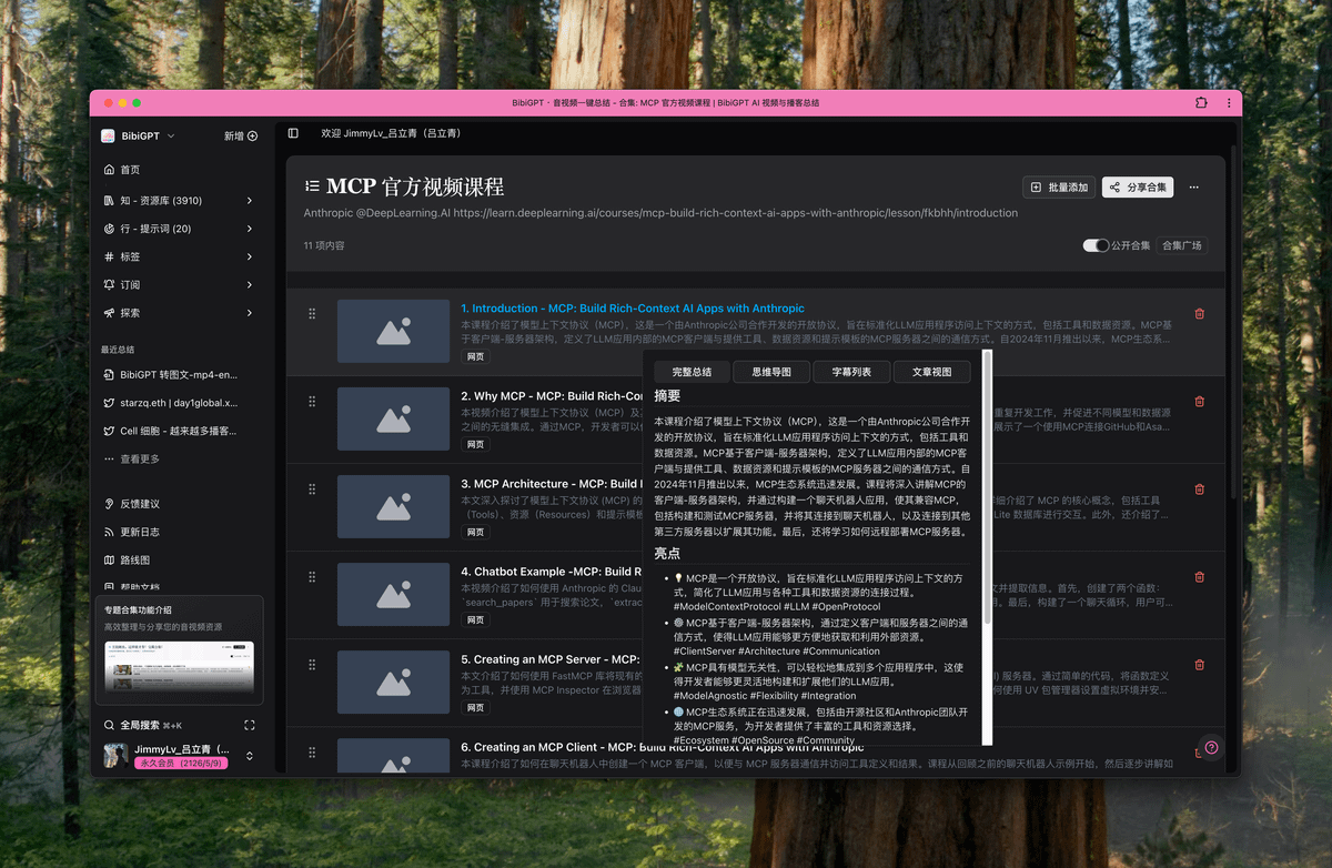 真心推荐 Anthropic 的 MCP 官方视频课程合集,破除了我对 MCP 的低估😂 对于很多新技术,还是得追本溯源,以人为径,二三手信息虽然易懂但因为角度不同就会造成误解。 我之前就刷完了一遍,然后在 BibiGPT 创建了合集,今天看到 howie 也推荐了所以拎出来分享给大家。 因为 DeepLearning 平台的 AI 相关视频质量实在太高了,甚至我还在 BibiGPT 做了特别的适配,对照 AI 总结和字幕原文来学习,体验更棒。 另外最近也在把 BibiGPT 的 OpenAPI 做成了 MCP Server,稍后再跟大家分享一下,就是说在任何 Chatbot 都能无缝总结音视频,甚至保存到自己的笔记软件等等。 🔗 合集链接在评论区 👇