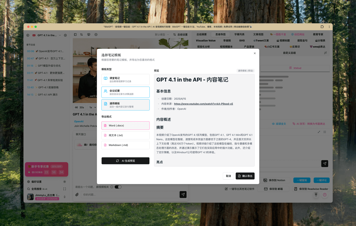 5. 个性化 AI 知识库 (适合知识付费变现) 视频专题汇总,导出知识库文章,联动 Notion、Obsidian、Readwise 等笔记工具,支持 docx, pdf, markdown 等丰富格式。 后续可直接上架我周末做的数字资产交易平台,加速优质付费内容变现。 已发布 🔗