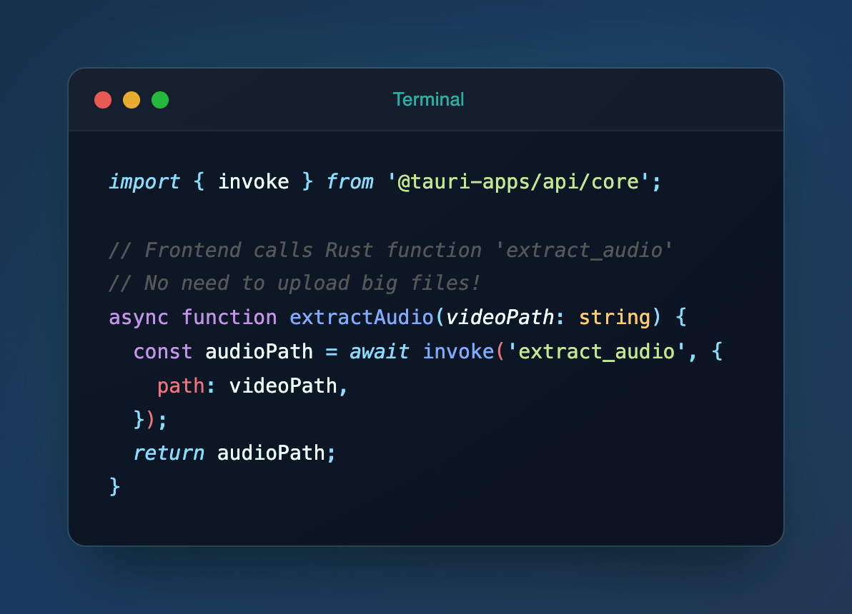 🦀 Rust Sidecar: 本地 FFmpeg 用户不想上传 2GB 的视频文件? 没问题,我们在本地处理。 Tauri 允许打包二进制文件 (Sidecar)。 我们在 Rust 里调用本地的 FFmpeg,几秒钟提取出音频。 只传几 MB 的音频给服务器。既省流量,又保护隐私。