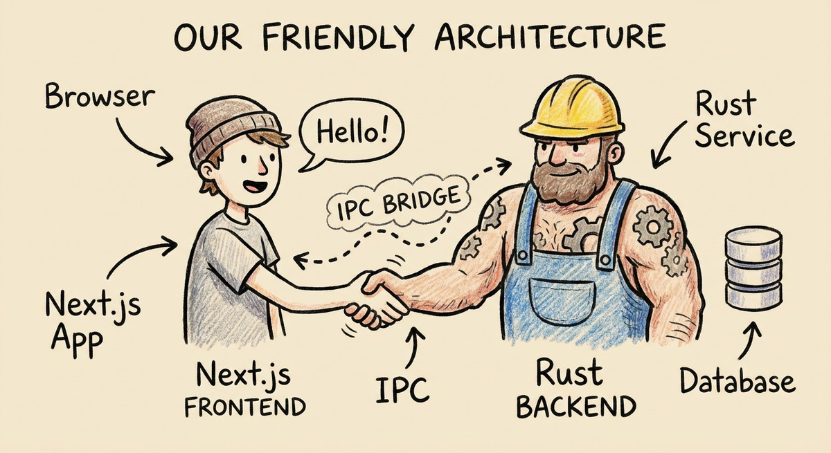 🏗️ 架构解析:Next.js + Rust 前端还是我们熟悉的 Next.js (静态导出)。 后端是 Rust。 它俩通过 IPC (进程间通信) 说话。 "UI 的归 UI,逻辑的归 Rust。" 既保留了 Web 的开发效率,又拥有了 Native 的性能。
