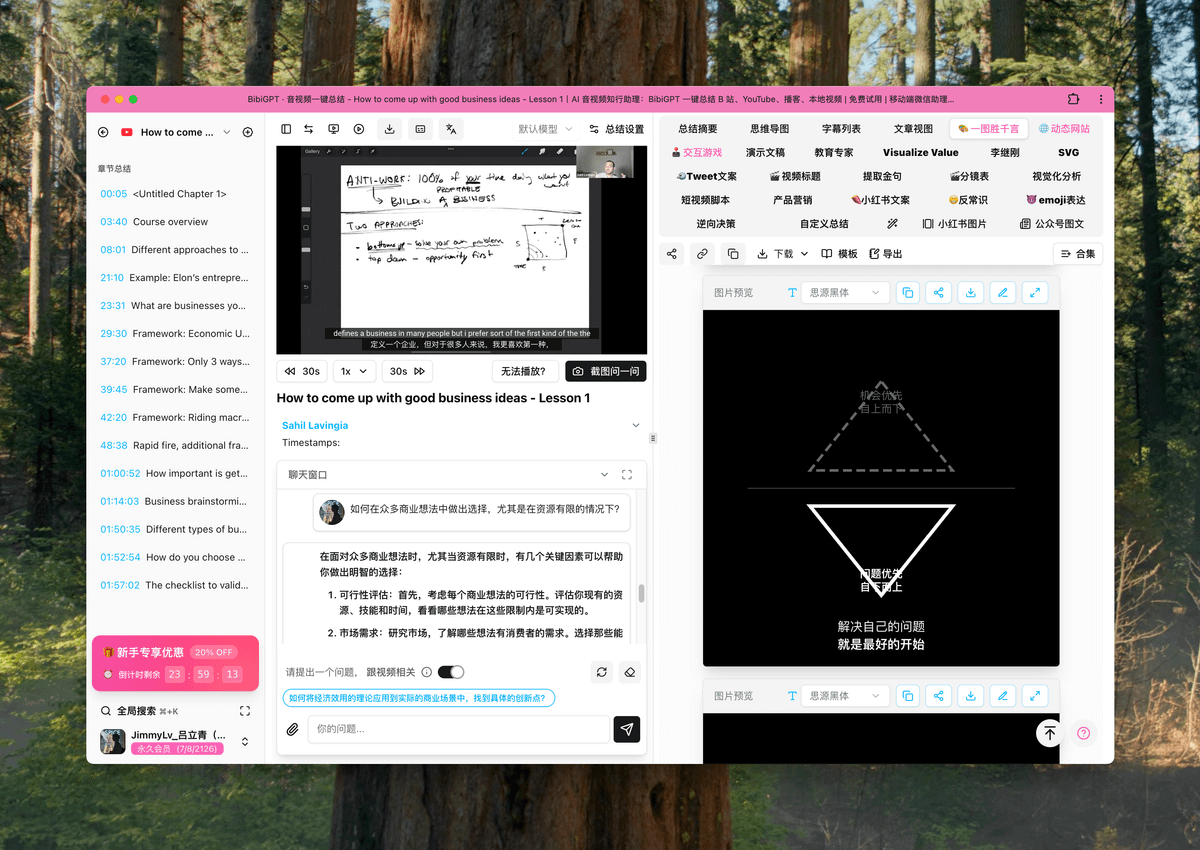 本节讨论了如何通过不同的盈利模式来激发商业创意。主要包括:产品(如数字产品、实体产品,一次性销售,例如Adobe),以及服务(如课程、咨询、自由职业)。 讲者强调自由职业是一个很好的起点,可以通过自动化重复性工作,逐步发展成服务机构或产品,并举例Basecamp和Mailchimp的成功案例。 讲者不推荐餐饮业,因为其失败率较高。最后,有人提问关于下周一的准备工作。