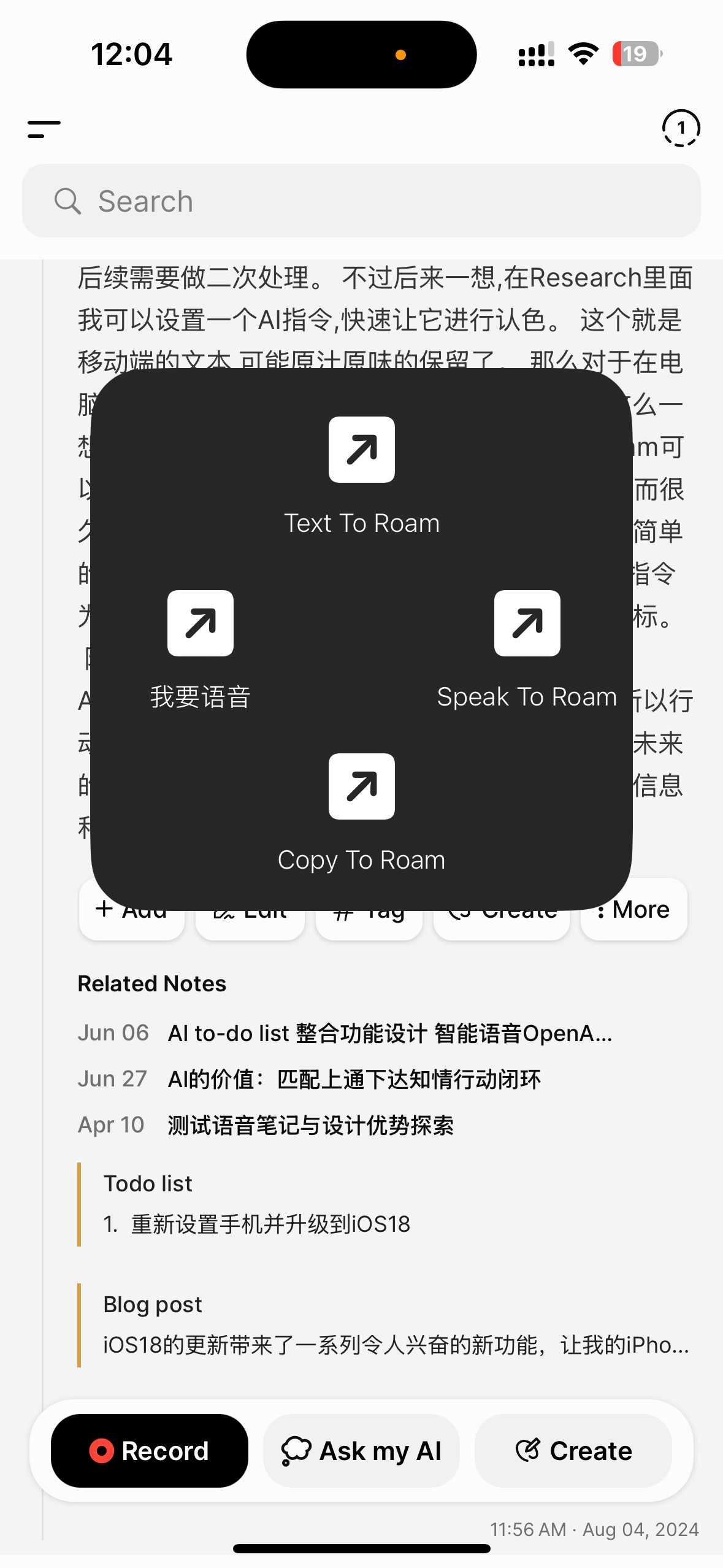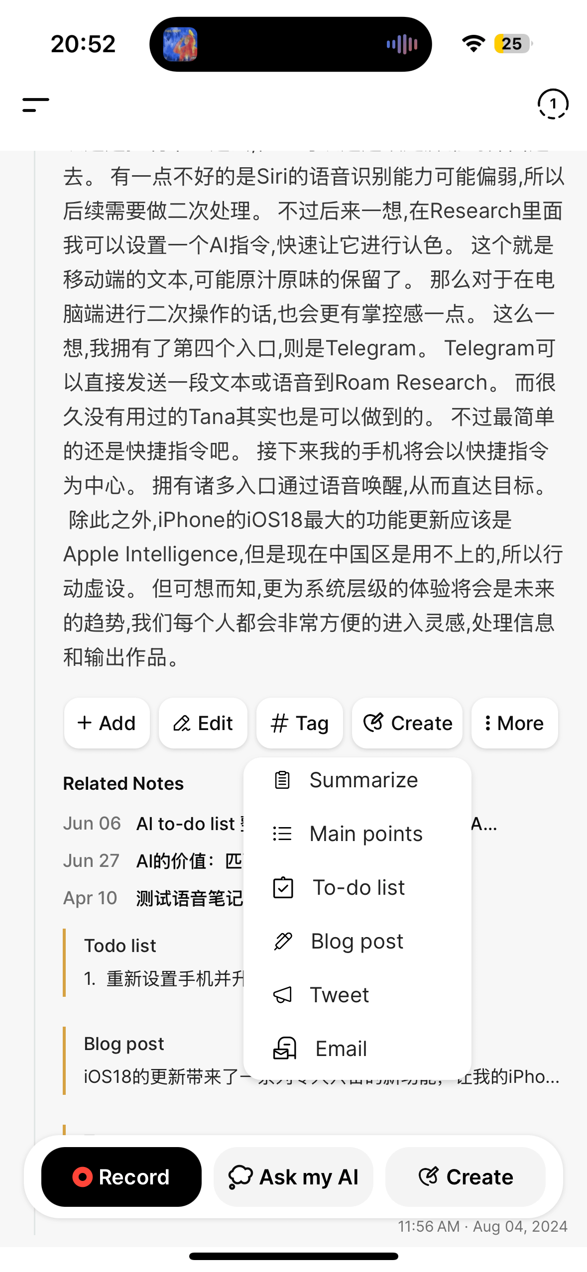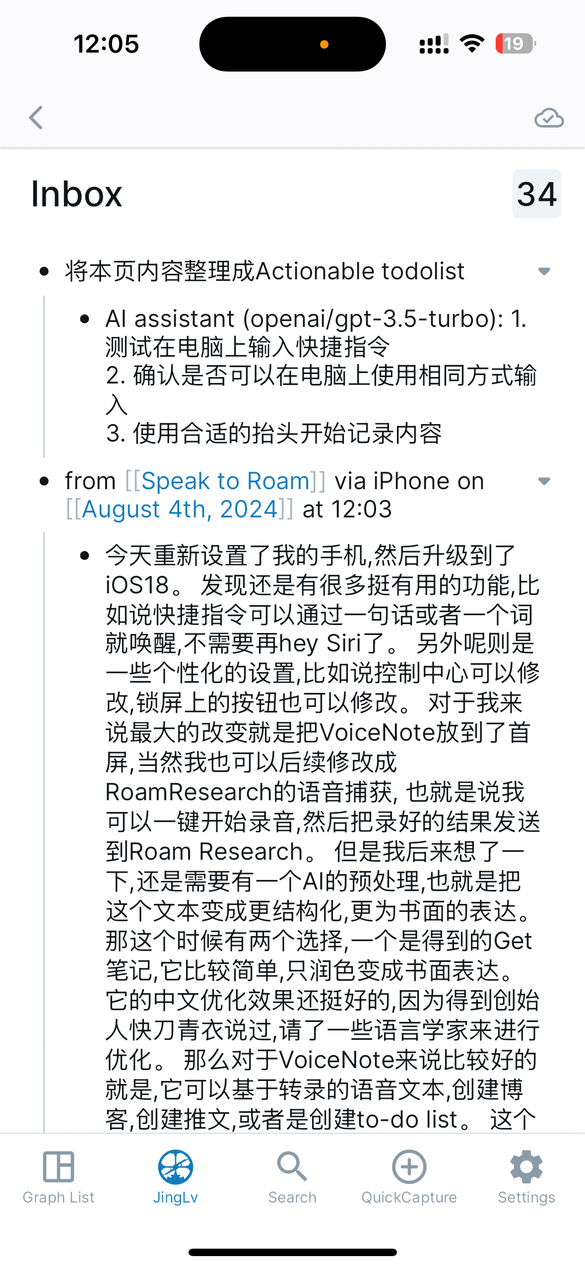 此外,个性化设置也得到了加强,控制中心和锁屏按钮都可以自定义,让操作更加便捷。 对我而言,最大的变化是将VoiceNotes放到了首屏。这让我可以一键开始录音,并将结果发送到Roam Research。 不过,我意识到还需要一个AI预处理步骤,将语音文本转化为更结构化、更书面化的表达。
