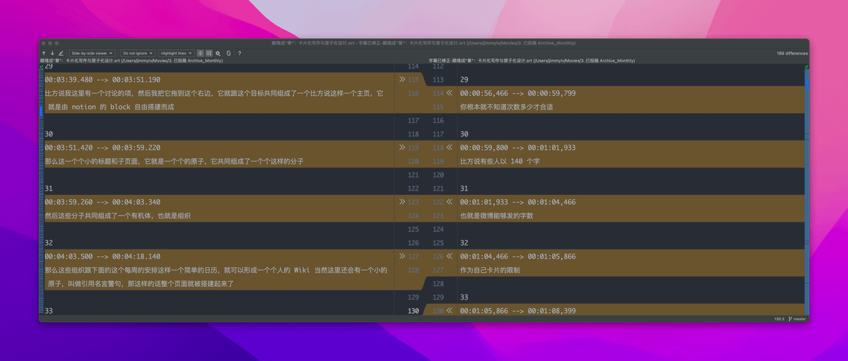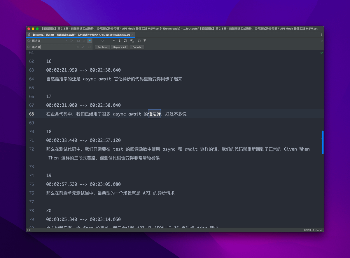 2. 字幕识别永远会有错误,但更重要的是如何快速「修正错误」 如图,飞书妙记生成的字幕文件,比剪映好太多了! tip: 导出 srt 文件,批量替换: - 使用文本编辑器或IDE的replace功能更强大,比如支持正则,一键替换 - 甚至,我写了一段bash脚本,直接命令行执行一遍即可,同时打开 IDE 进行二次润色