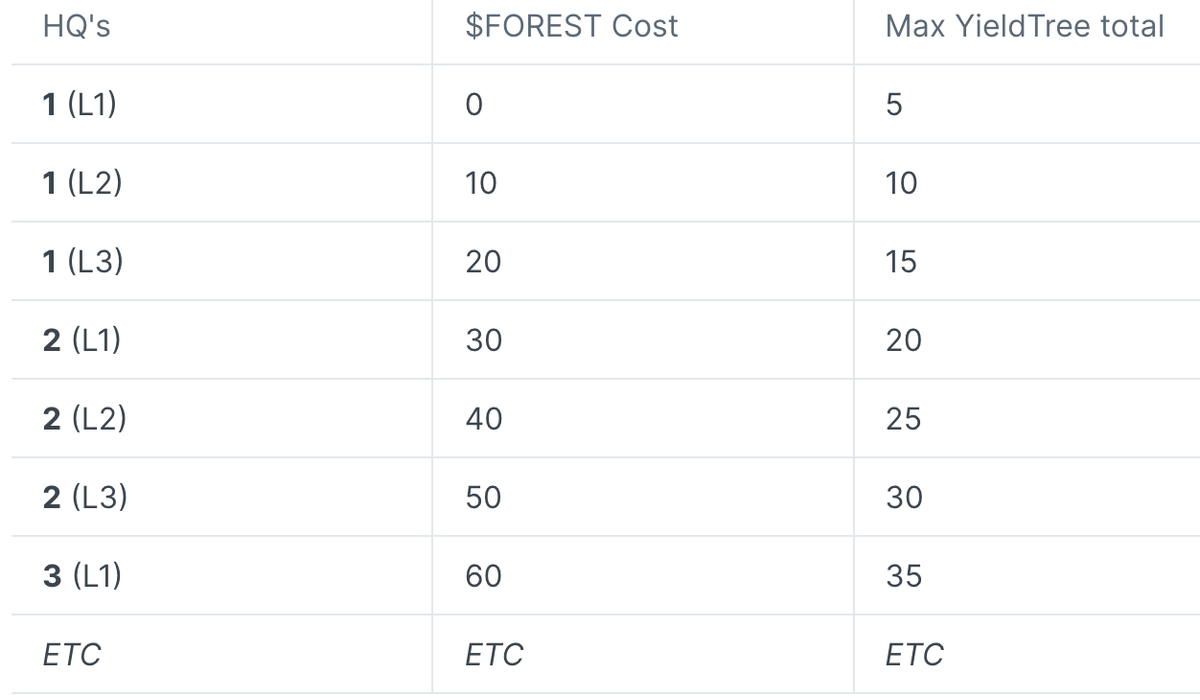The Foresters are housed within a Forester HQ, each HQ can house between 5 - 15 YieldTrees. HQs start at Level 1, housing 5 YieldTrees and scale up to Level 3, housing 15 YieldTrees.