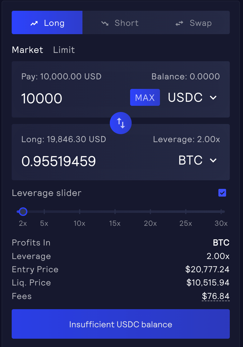 Let's assume you deposit $10,000 $USDC and apply a leverage of 2x - your purchasing power increases by two-fold.