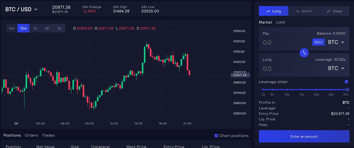 Head over to gmx.io/trade and you'll be met with a platform that looks like this..
