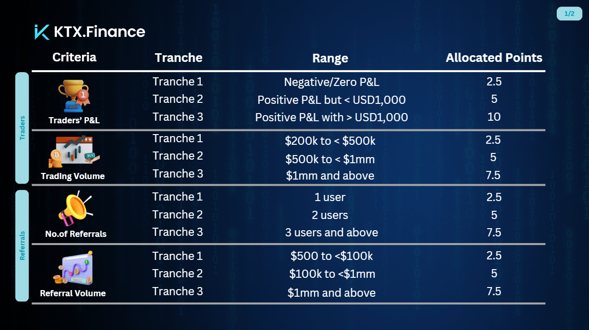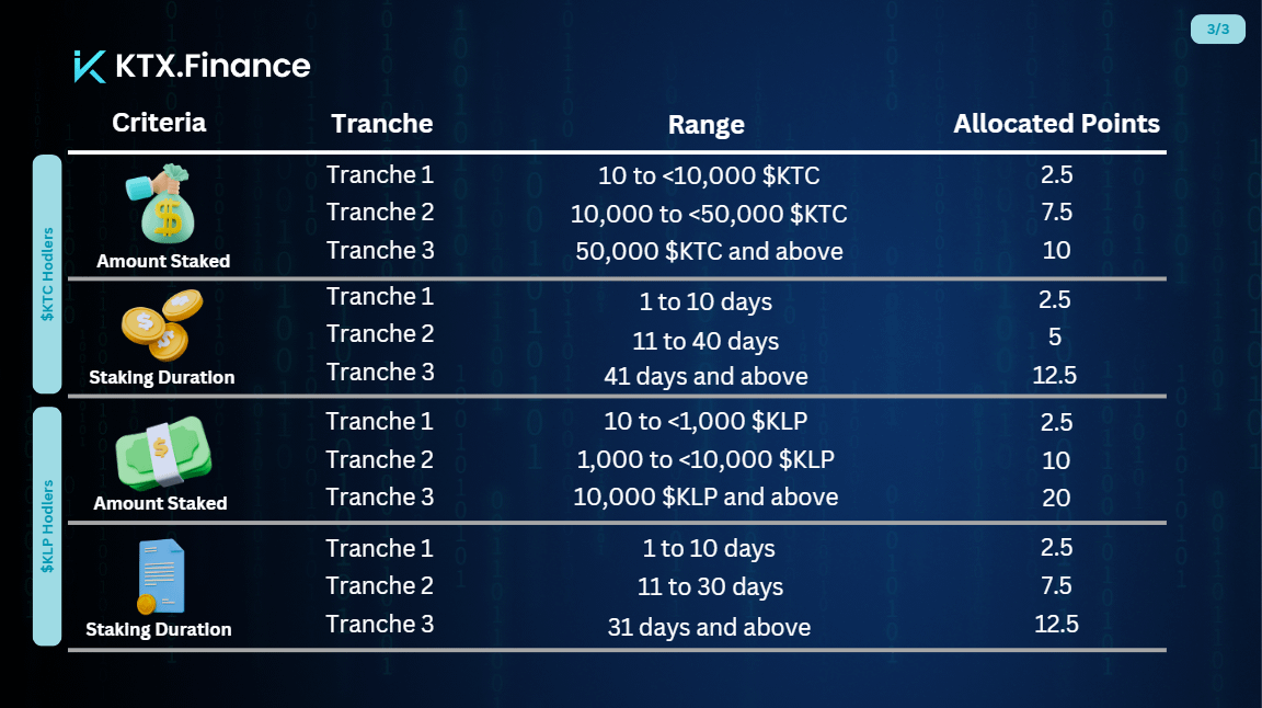 The amount of $KTC you receive will be proportional to the amount of points you have, as a fraction cumulative points of all eligible KTX users