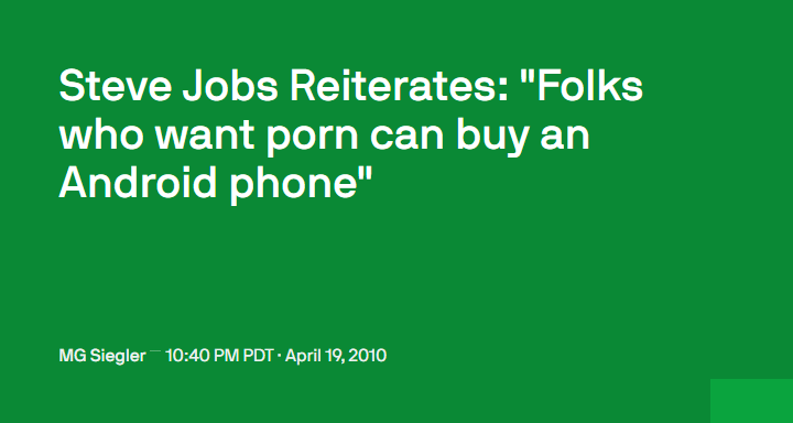 Just as important, (2) platforms have a right to editorialise what the users experience on the platforms they've built. Steve Jobs had one of his "if you don't like it go buy an Android" comments on the very topic. That's how platforms differentiate. techcrunch.com/2010/04/19/steve-jobs-android-porn/