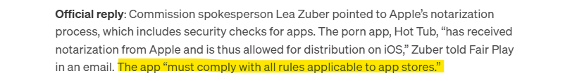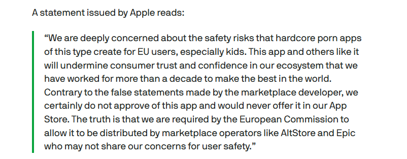 It's a bit odd that Epic would want to promote this "porn app" as the win for the DMA, and force the EC to defend the risks caused. When I think most consumers can pretty easily understand that the costs and risks are not worth the benefits.