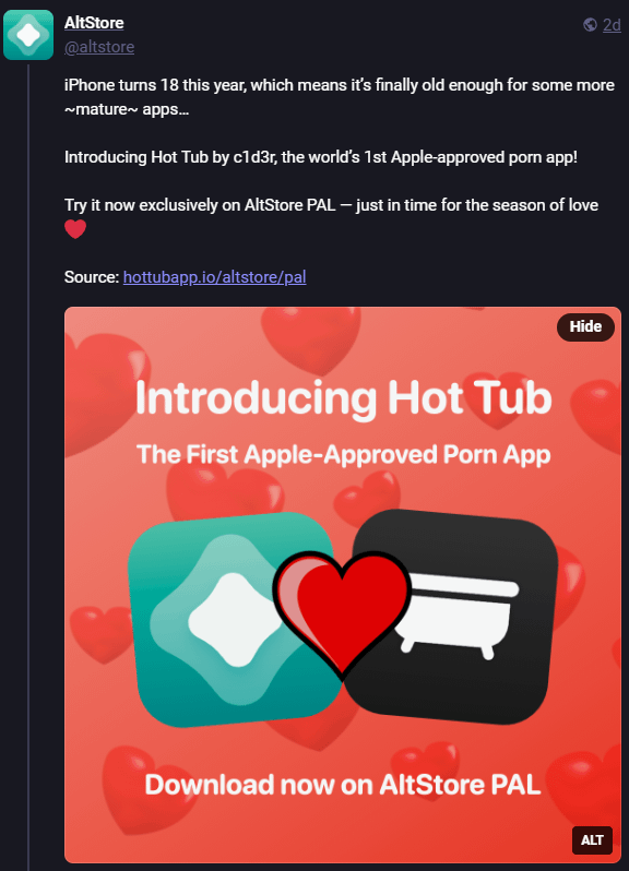 On Monday, AltStore announced the launch of Hot Tub, "the world's 1st Apple-approved porn app". AltStore is one of the new app stores that have been able to launch on iOS because of Europe's Digital Markets Act