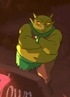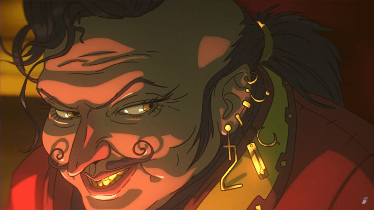 A grinning face with golden teeth. Multiple earrings, including one with the Rune of Lime.