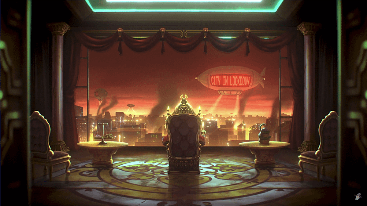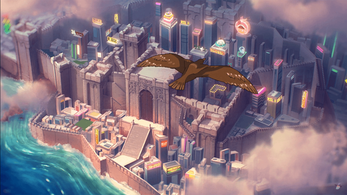 This location was previewed months ago, but still amazing to see it in full color. We can fully see the classical gate and turreted wall to a fortress, but inside are modern-looking skyscrapers with brightly lit neon signs.