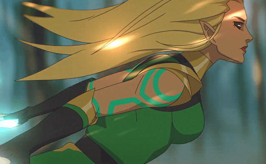 7/ This huntress has elven ears and tribal-type tattoos on both arms.