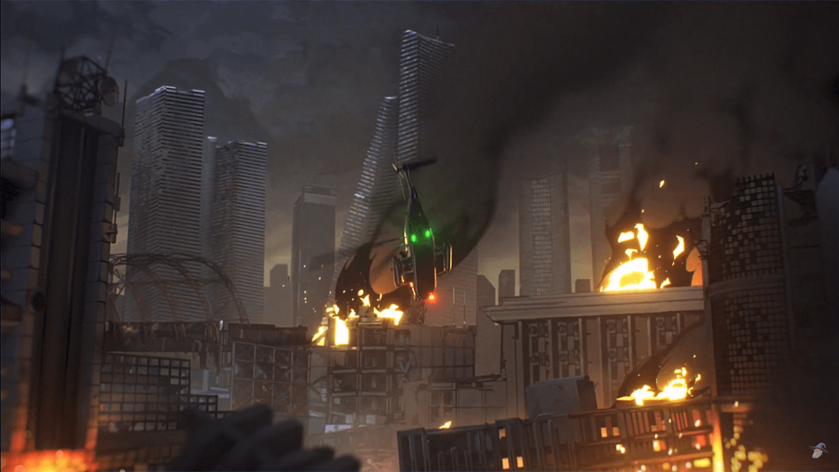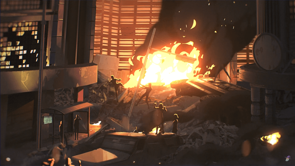 8/ We switch to a very different and chaotic scene. A modern-looking city with multiple fires and a helicopter flying overhead. Not the type of scene one would expect from a “wizard show.” First sign that this is something different from the norm.