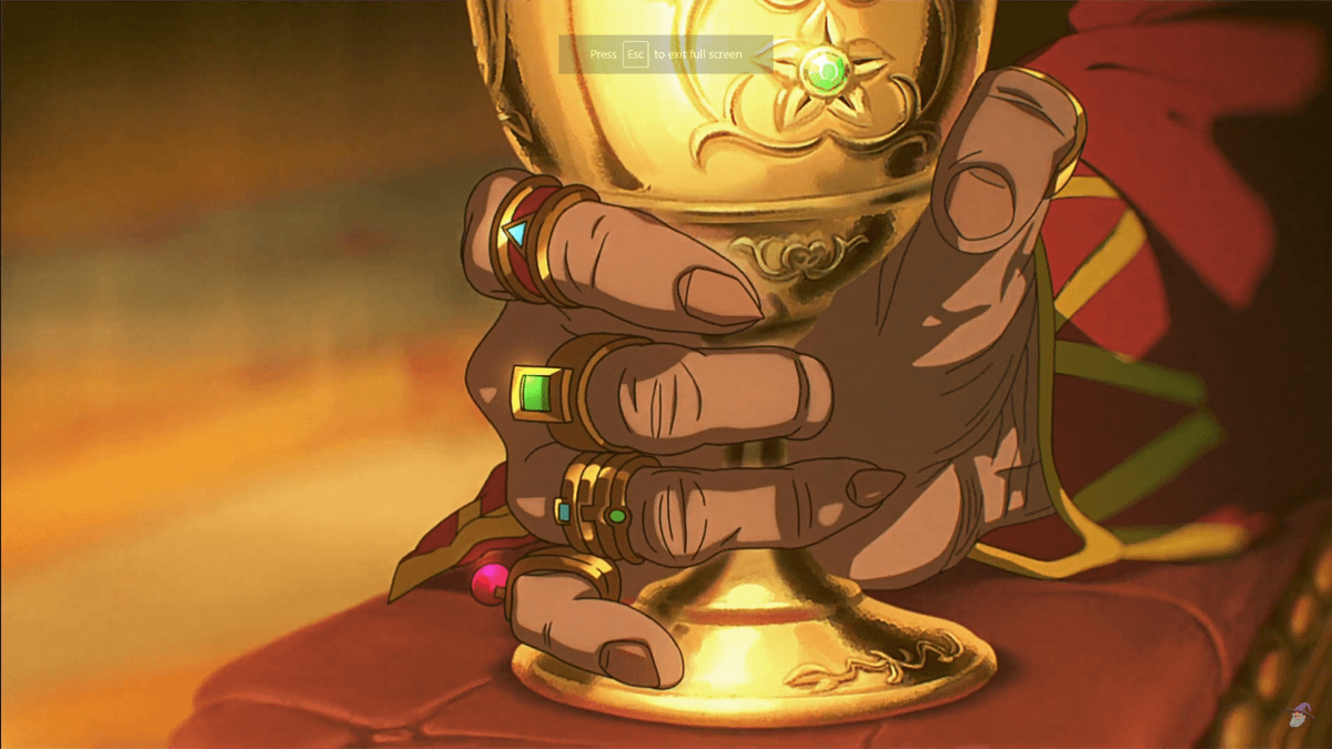 37/ A meaty hand grasps a golden chalice. The hand has multiple rings equipped, including one with the Rune of Fire. First evidence of Rune-imbued objects?