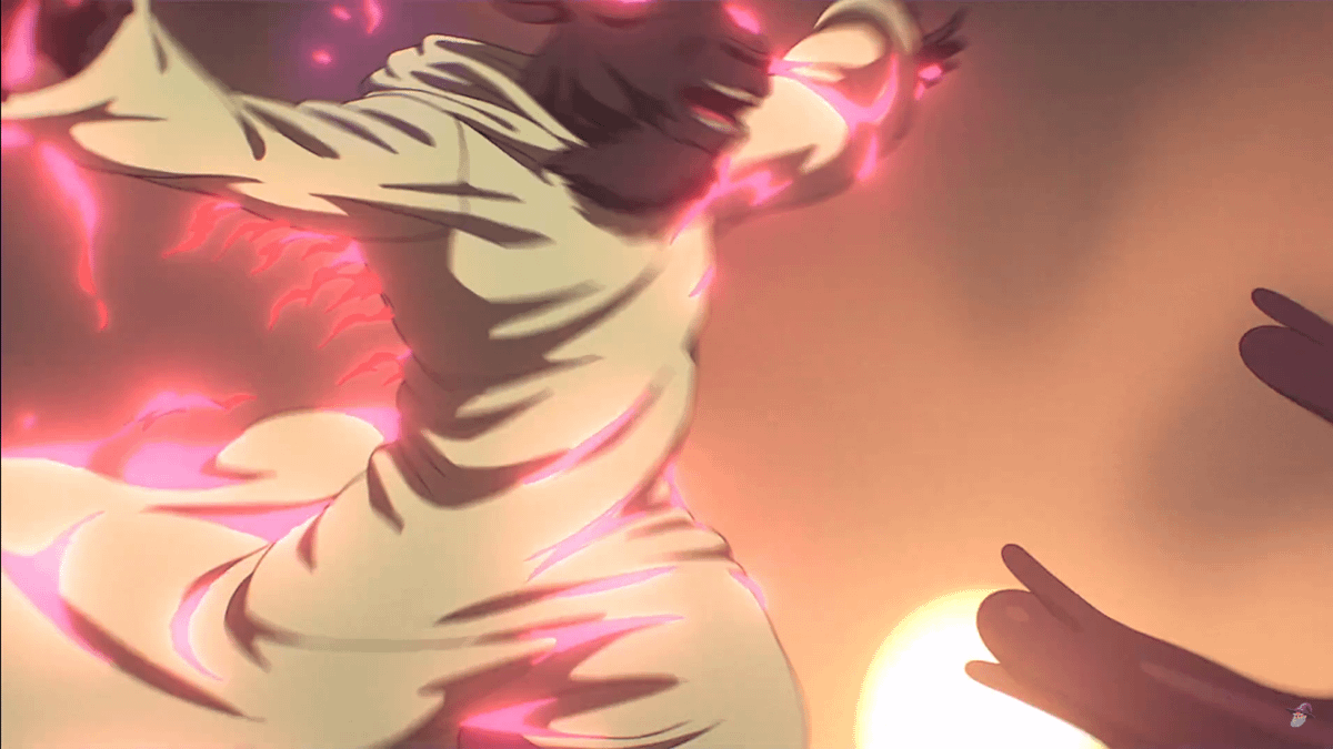 We transition to another scene of urban destruction. Fighters are having what looks like a taekwondo match while others cheer them on against a fiery backdrop.