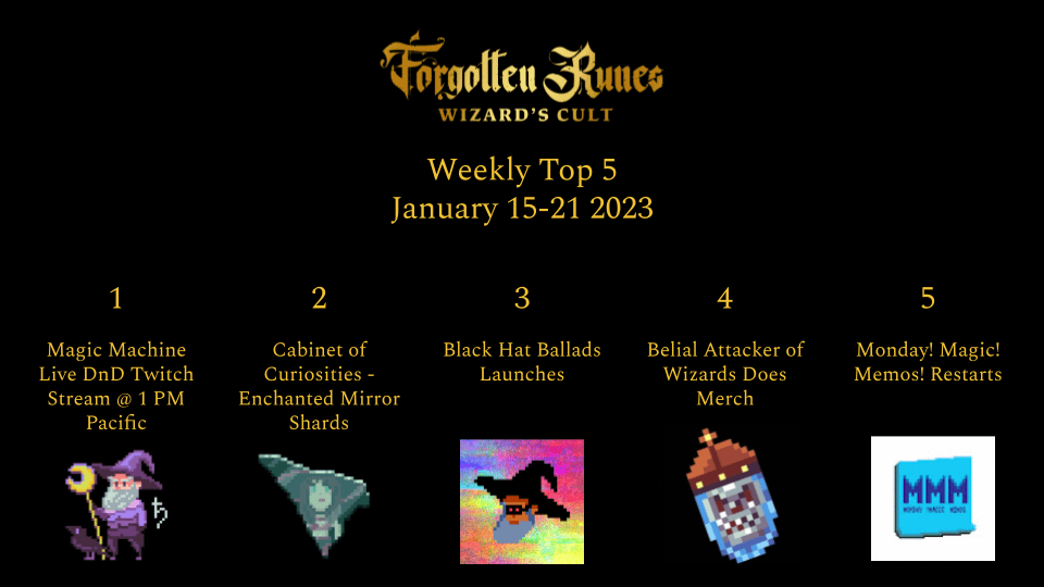 3. @LDojangMusic launched Black Hat Ballads, a community lore initiative to tell the stories of these wizards. Leif will use a multimedia approach, including narrated Lore, music, sound design, & graphics. The Ballads will be mintable as well.