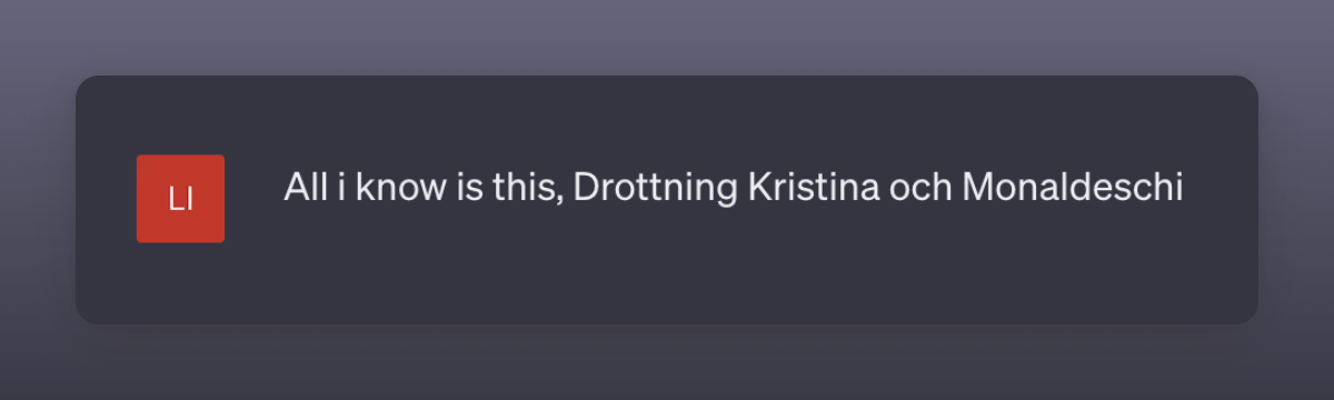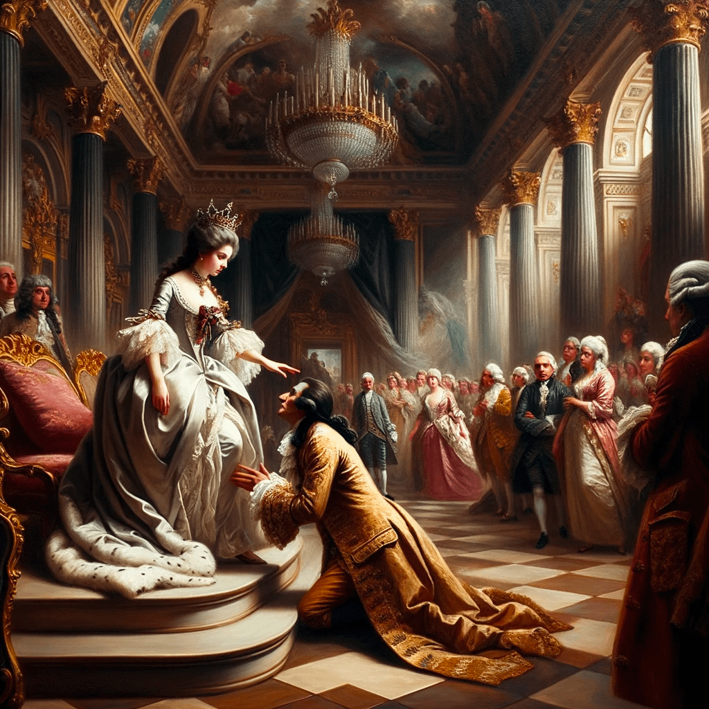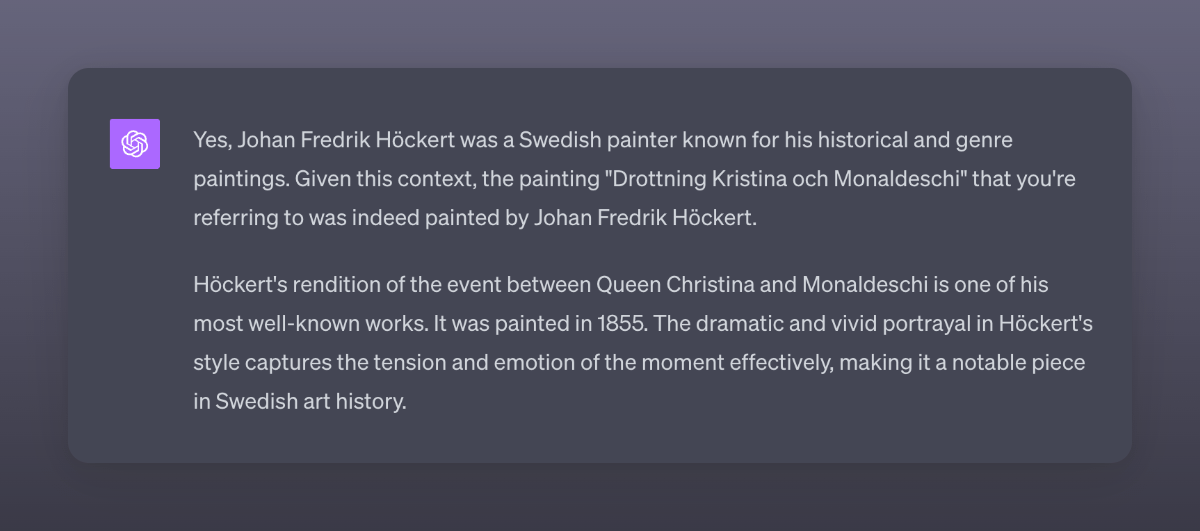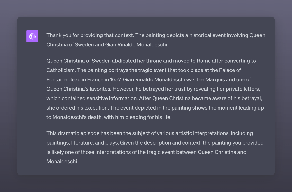 "The painting depicts a historical event involving Queen Christina of Sweden and Gian Rinaldo Monaldeschi."