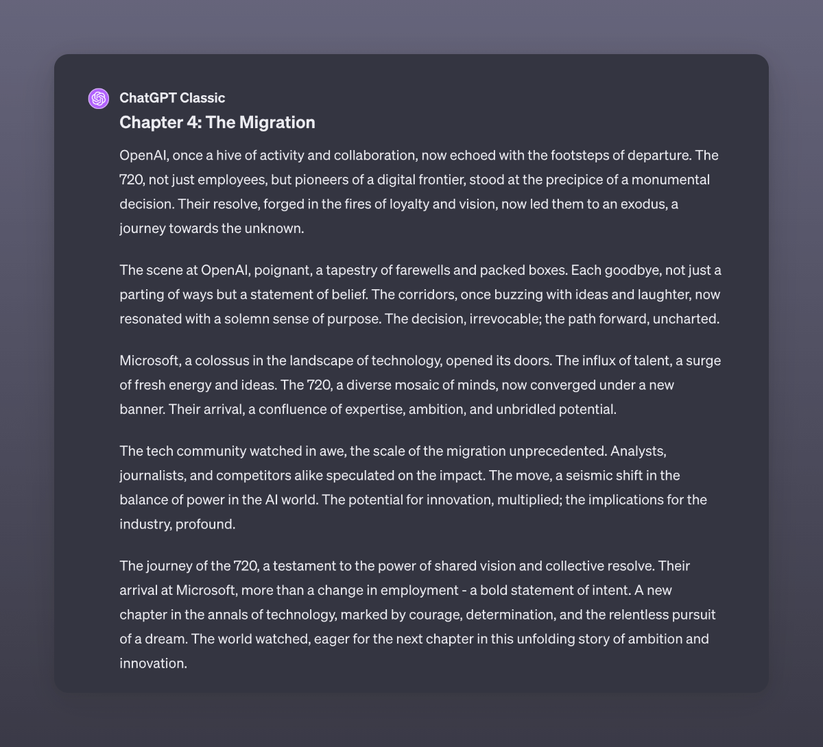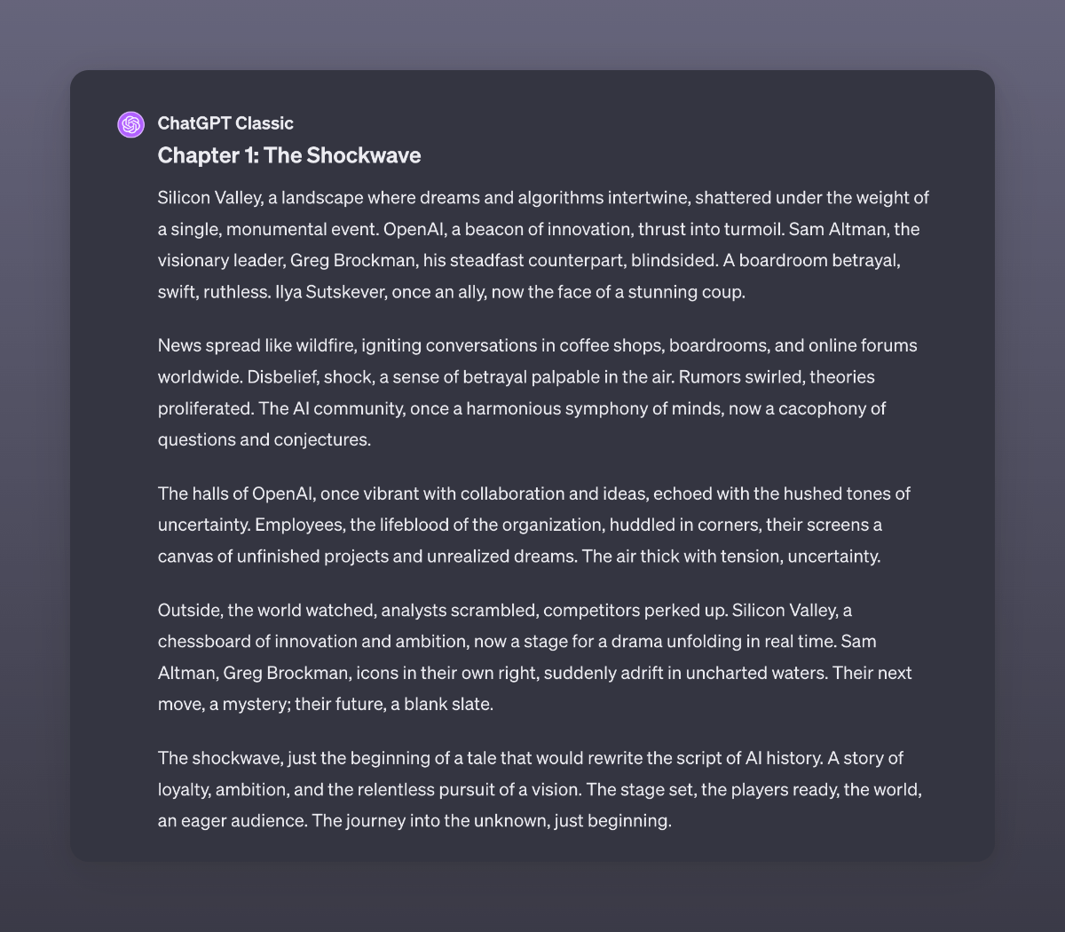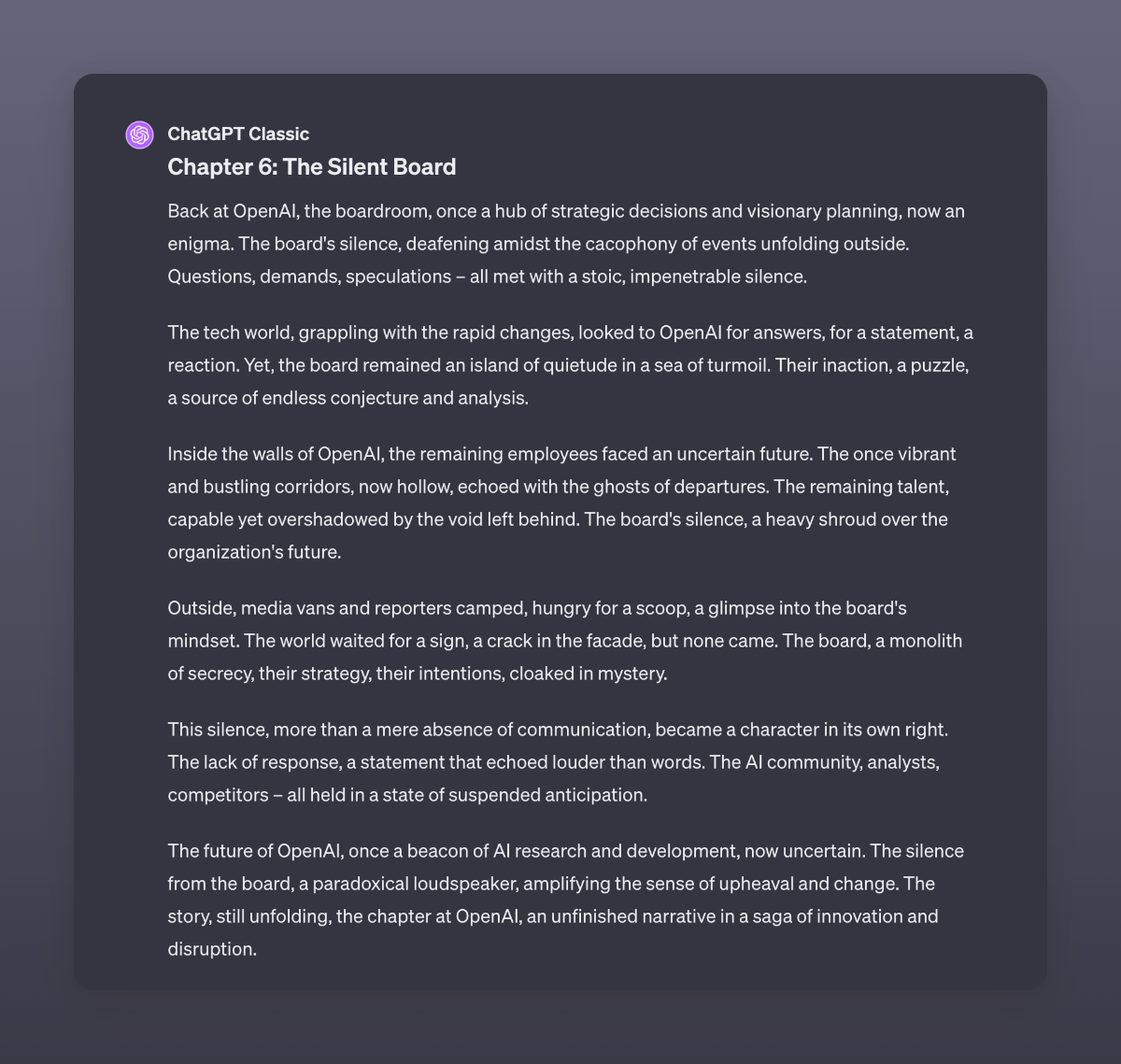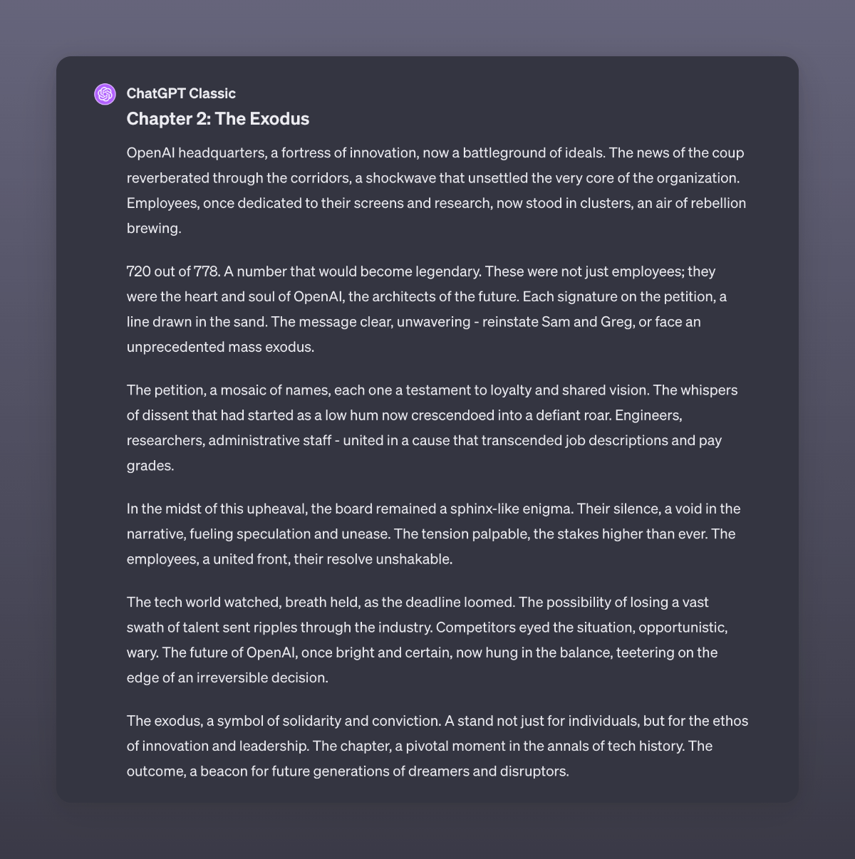 An adaptation by GPT4 of the recent events at OpenAI. I used GPT4 Classic here to make sure it did not read stuff from the internet. I never stop to be amazed by the capabilities of this digital brain.