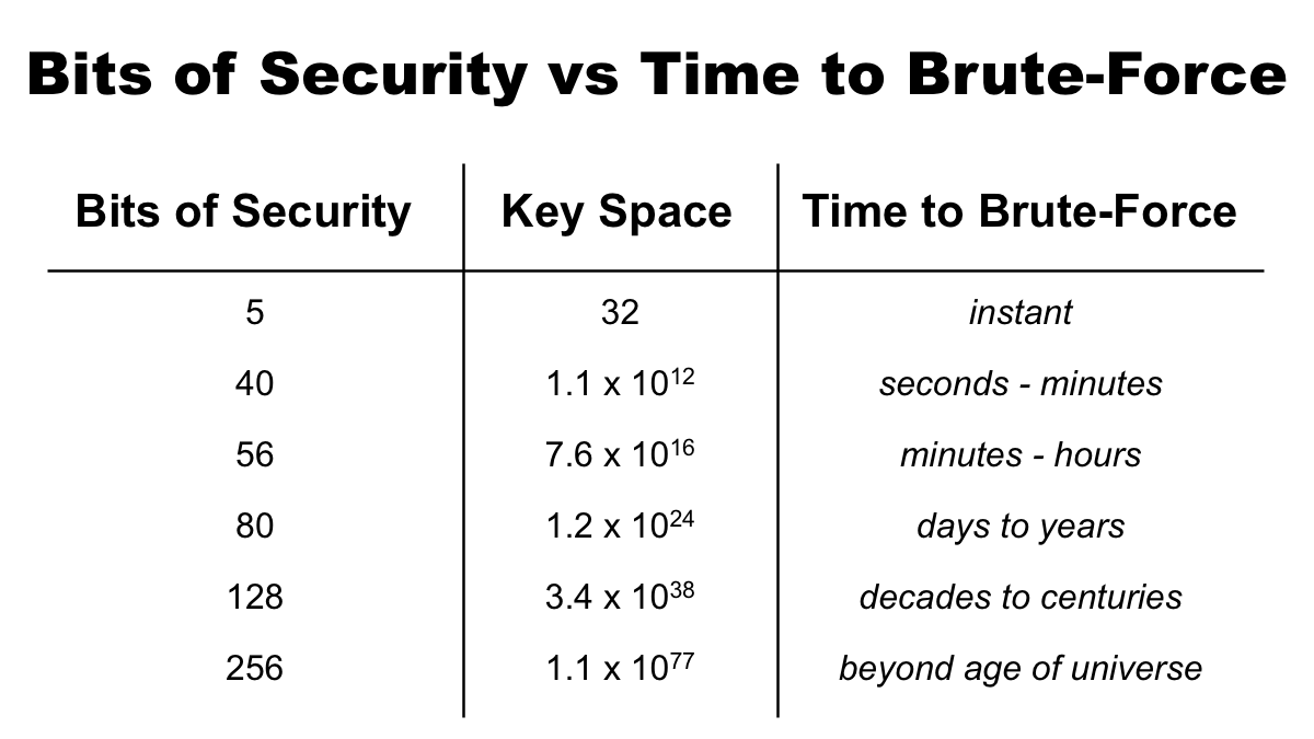 (11/13) Strictly speaking, bits of security reflect the effort needed to break a system using the best-known attack (not just brute-force).