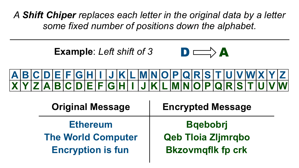 (5/13) For example, let's say you are encrypting a message with a shift cipher with a left shift of 3. If your message has a D, it would be replaced with an A.