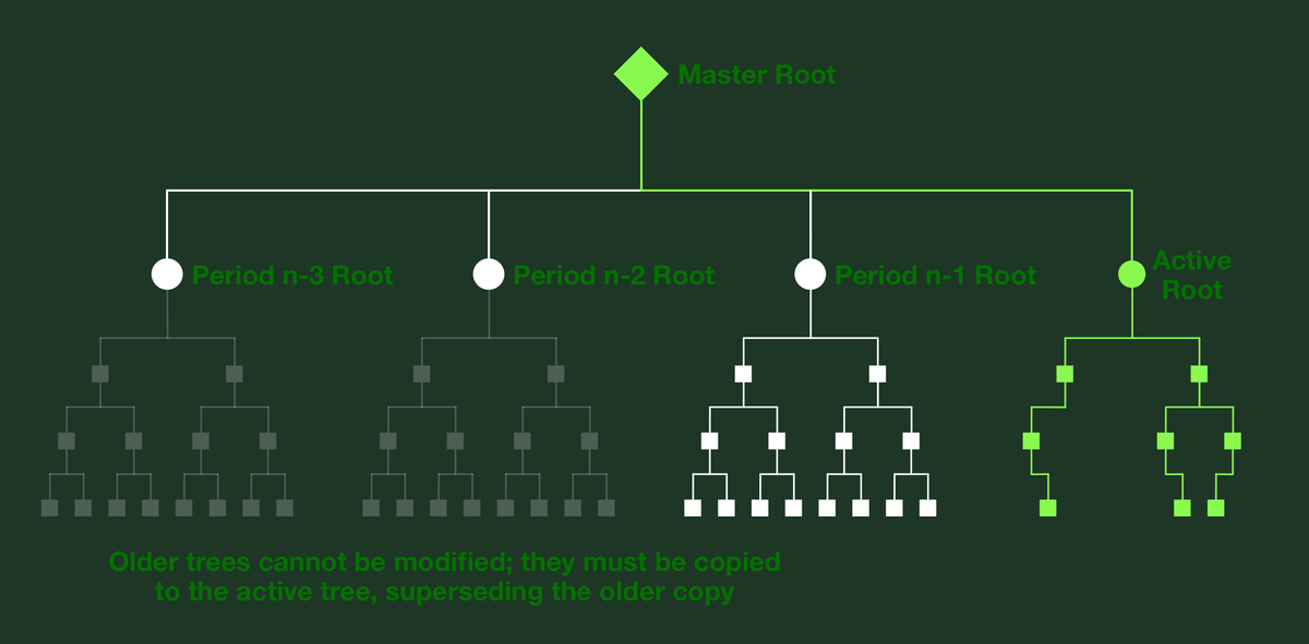 (12/20) Each node is required to hold a certain number of archived trees (proposal: 1 archive tree plus active tree). When a period ends, a node is free to release older trees.