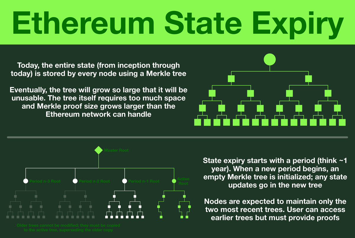 (8/20) State expiry keeps the size of the EVM's state at a manageable level; nodes will be allowed to offload stale data in order to make room for new objects.