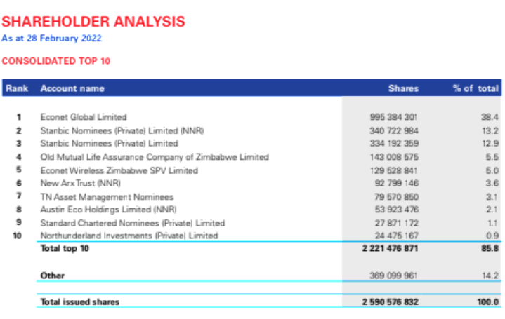 38.4% is held by Econet Global Limited a privately owned group registered in Mauritius.