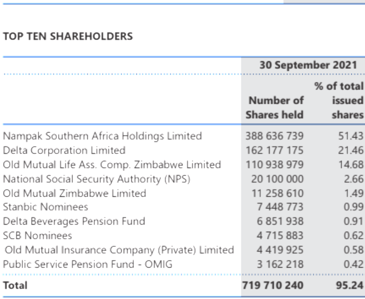 21,46% is controlled by Delta Beverages Corporation, a non and alcoholic beverage manufacturer in Zimbabwe.