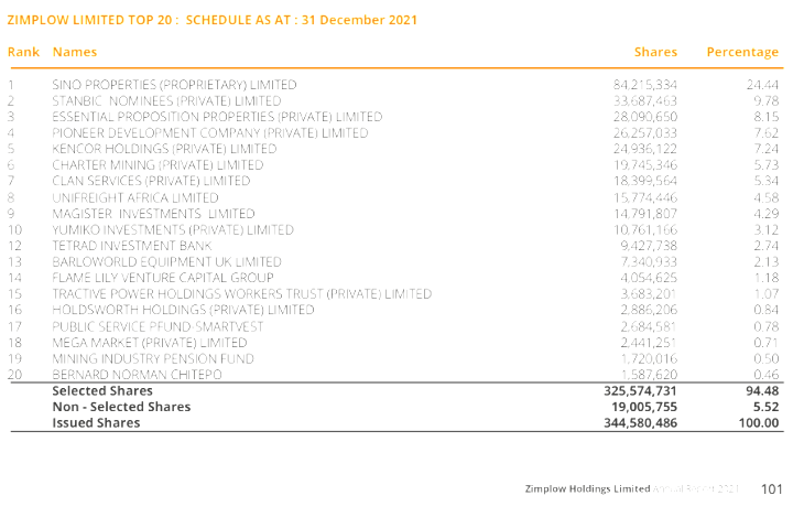 9.92% controlled by Unifreight Africa after swapping Birmingham Investments & Tredcor for ZIMW shares.