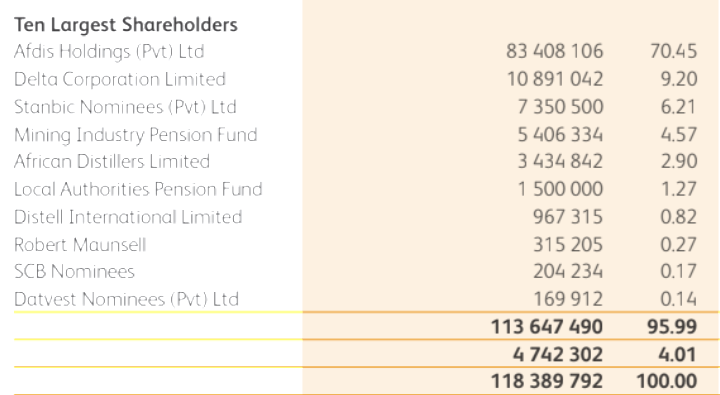 Afdis Holdings (AH) an investment vehicle owned by DLTA and Distell of SA controls 70.45%.