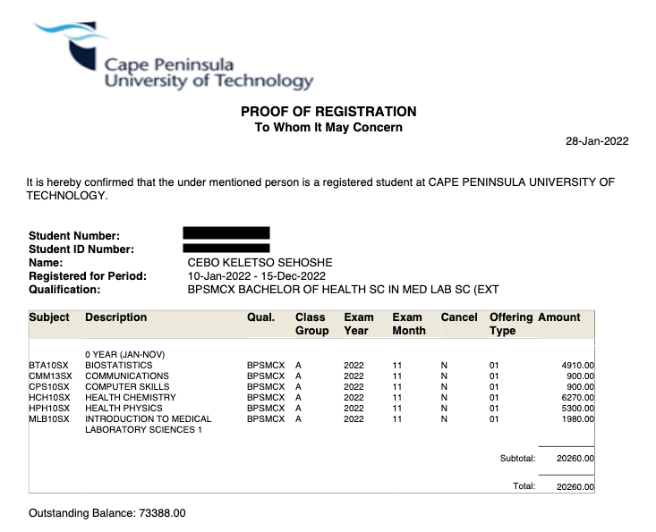 6/10 ๐ฅณ ๐ฅผ He has since secured a place to study Medical Laboratory Sciences at the Cape Peninsula University of Technology (@CPUT). He needs financial support to cover school fees (including book and equipment costs) & student residence costs for the first semester of '22.