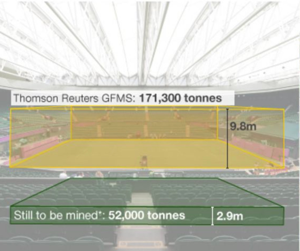 All of the gold ever mined equals about 187 thousand tons. That may sound like a lot, but gold is so dense it would fit into a cube just 21 meters on each side. Or a tennis court with the gold stacked almost 10m high.