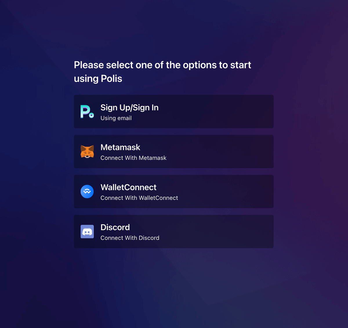 👉1. Polis: Polis is a simple to use web based Ethereum wallet, that you can use to access integrated DApps. You can connect your already existing MM wallet or create a new one with your email address or discord account.
