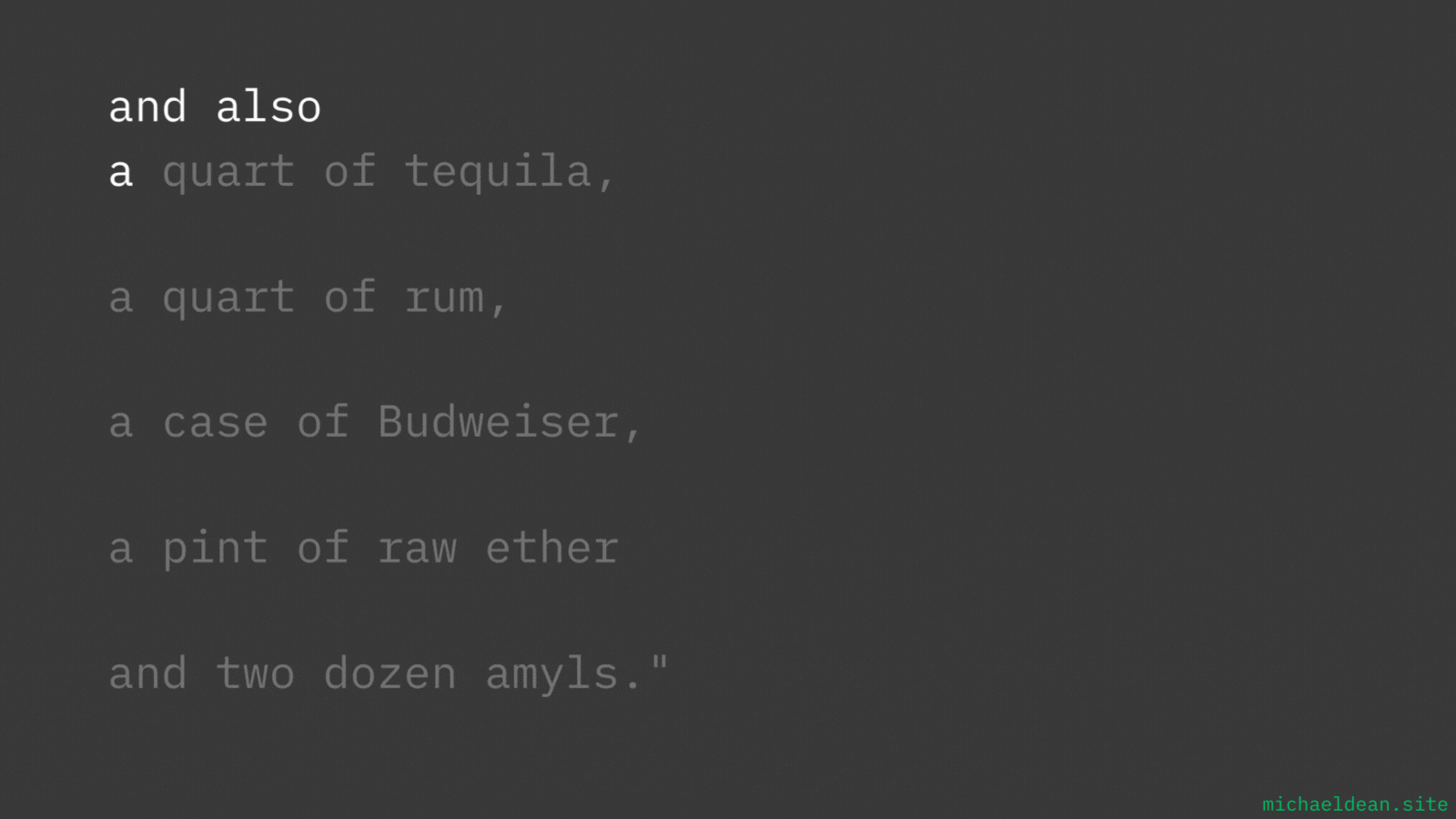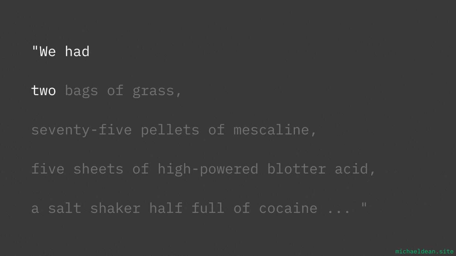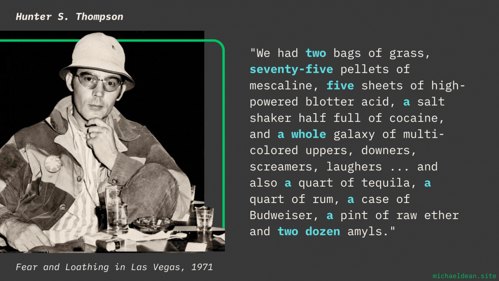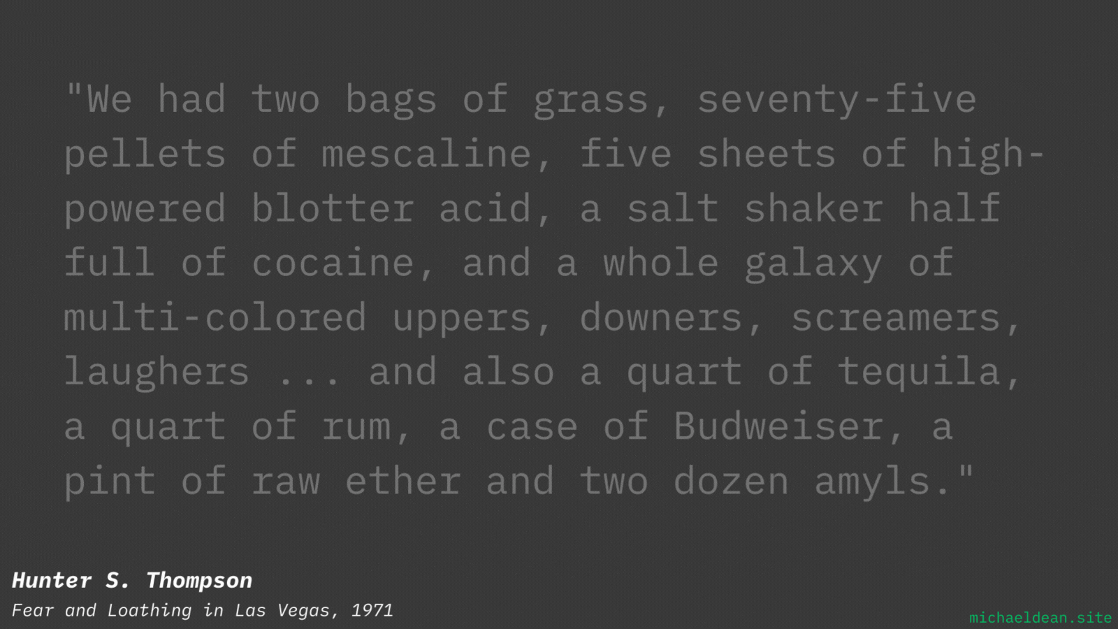 In the opening of 'Fear and Loathing in Las Vegas,' Hunter S. Thompson shows off his absurd drug collection.