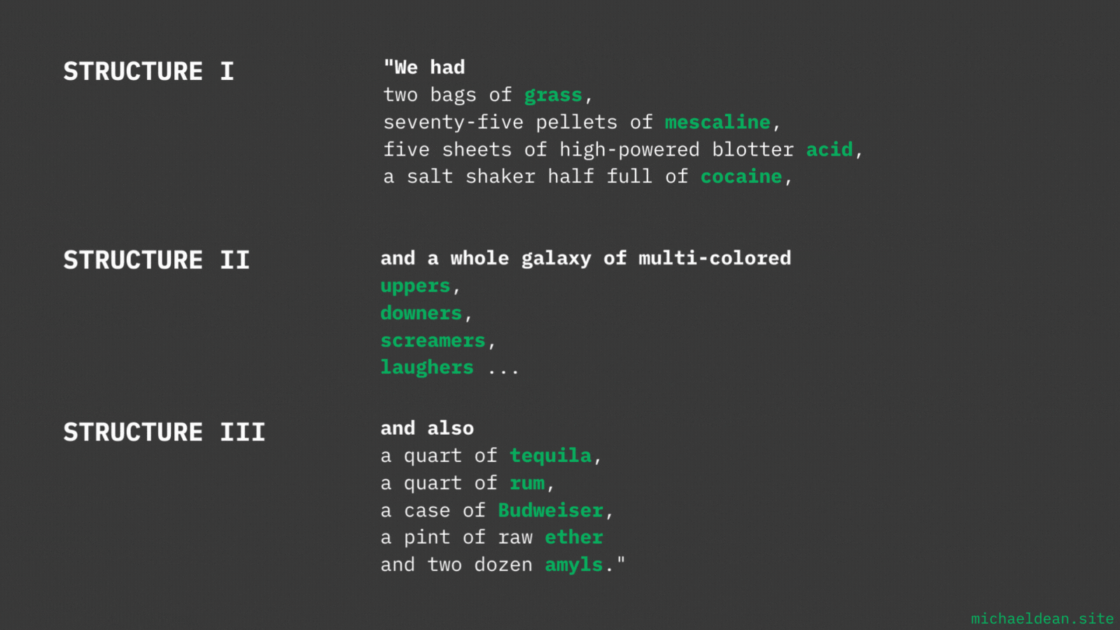 Here's a breakdown on how to use rhythm and form to make epic list-sentences (no drugs required):