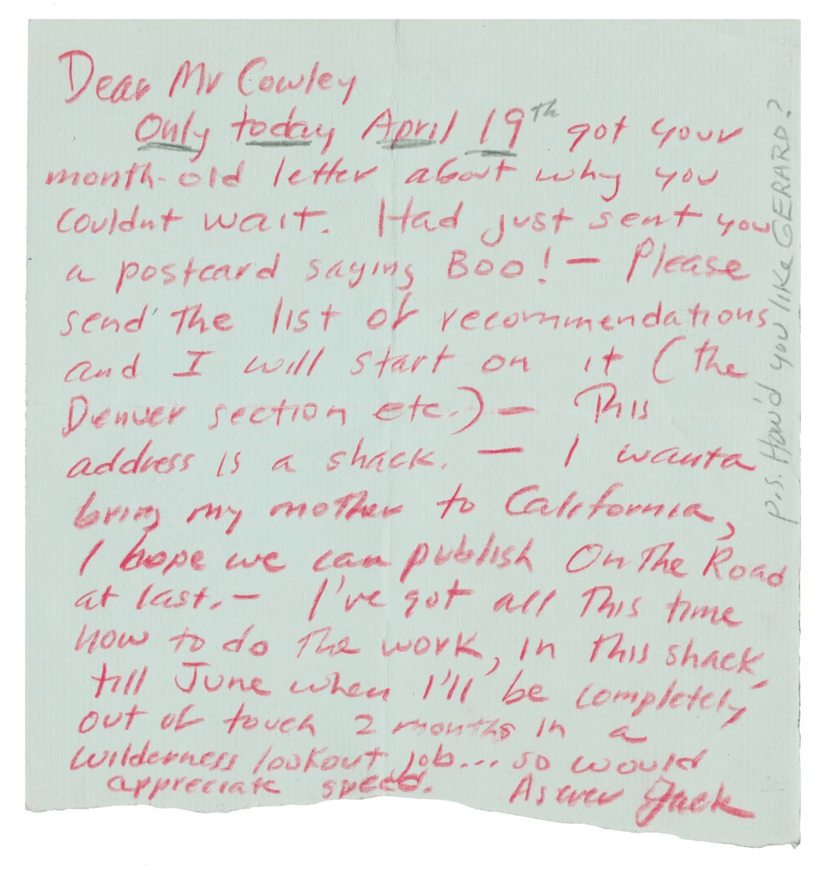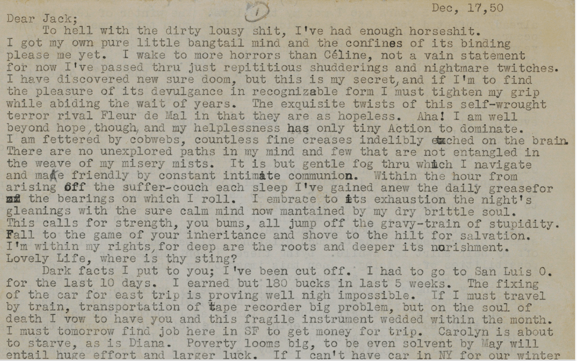 1950, in the winter after their last road trip, Cassady sends Kerouac the "Joan Anderson Letter."