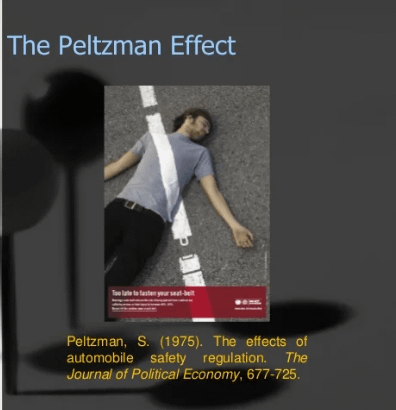 A fines de los 60s se introdujeron medidas de seguridad en los autos para reducir niveles de mortalidad. En 1975, Sam Peltzman descubrió que las medidas no habían reducido mortalidad porque habían más accidentes dado que conductores tomaban mayores riesgos.