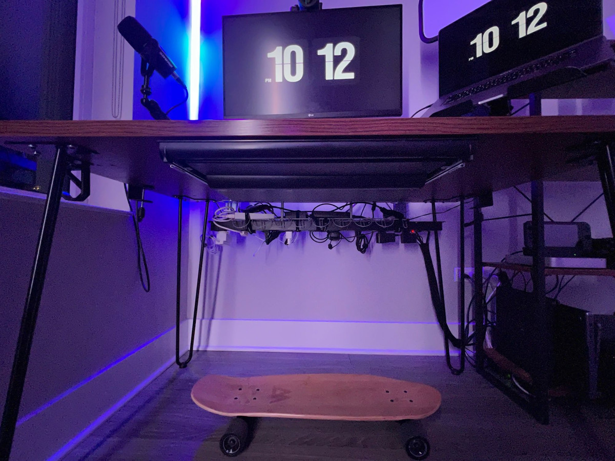 Keeping this many cables out of sight can be a tall order. Everything’s plugged into a 9-Outlet Surge Protector mounted under the desk alongside a cable management basket to hold any AC adapters and excess cable length.
