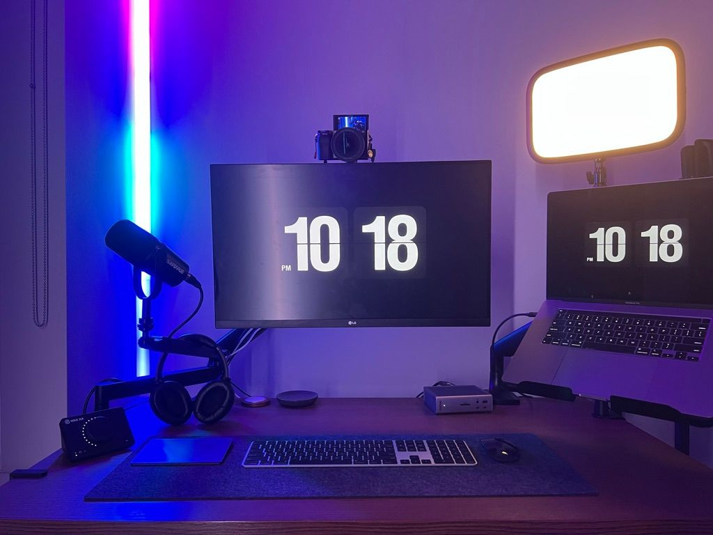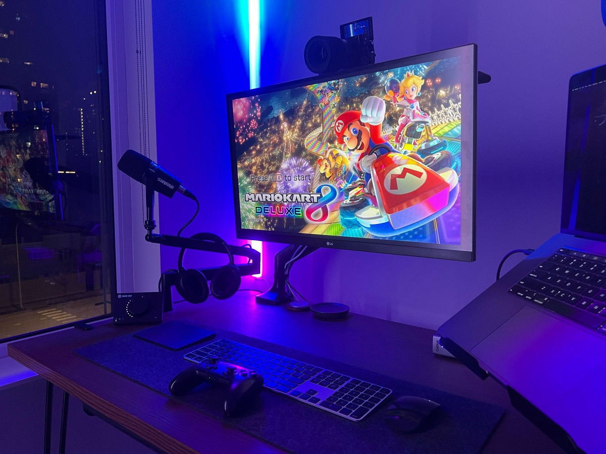 I was well on my way to a Twitch streamer’s setup, so I just leaned into it. An Elgato HD60 S+ lets me pass video to the display and capture HDMI signal for streaming. I have a PlayStation 4, Nintendo Switch, and an Intel NUC connected to the capture card via an HDMI splitter.
