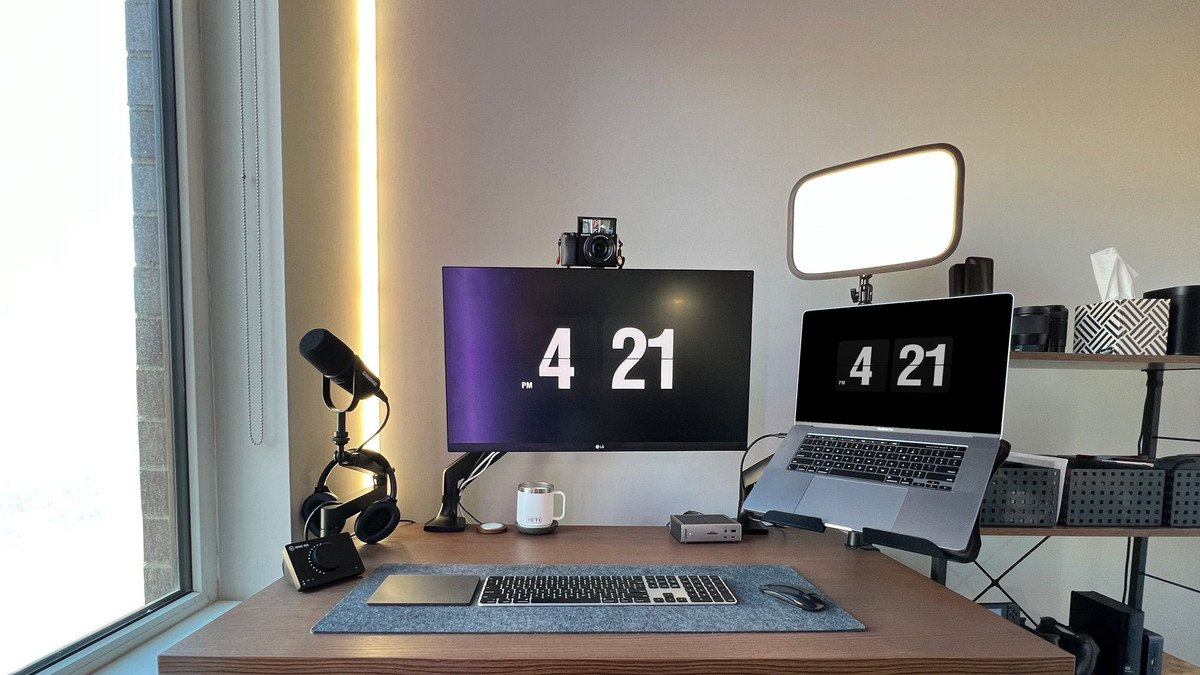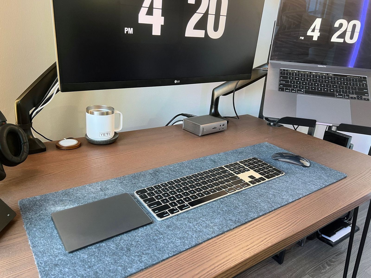For a display, I’m rocking a VESA-mounted LG 27 Inch 4k Display on a Jarvis Monitor Arm as my primary display, and my laptop serves as a second display atop a Jarvis Laptop Arm.