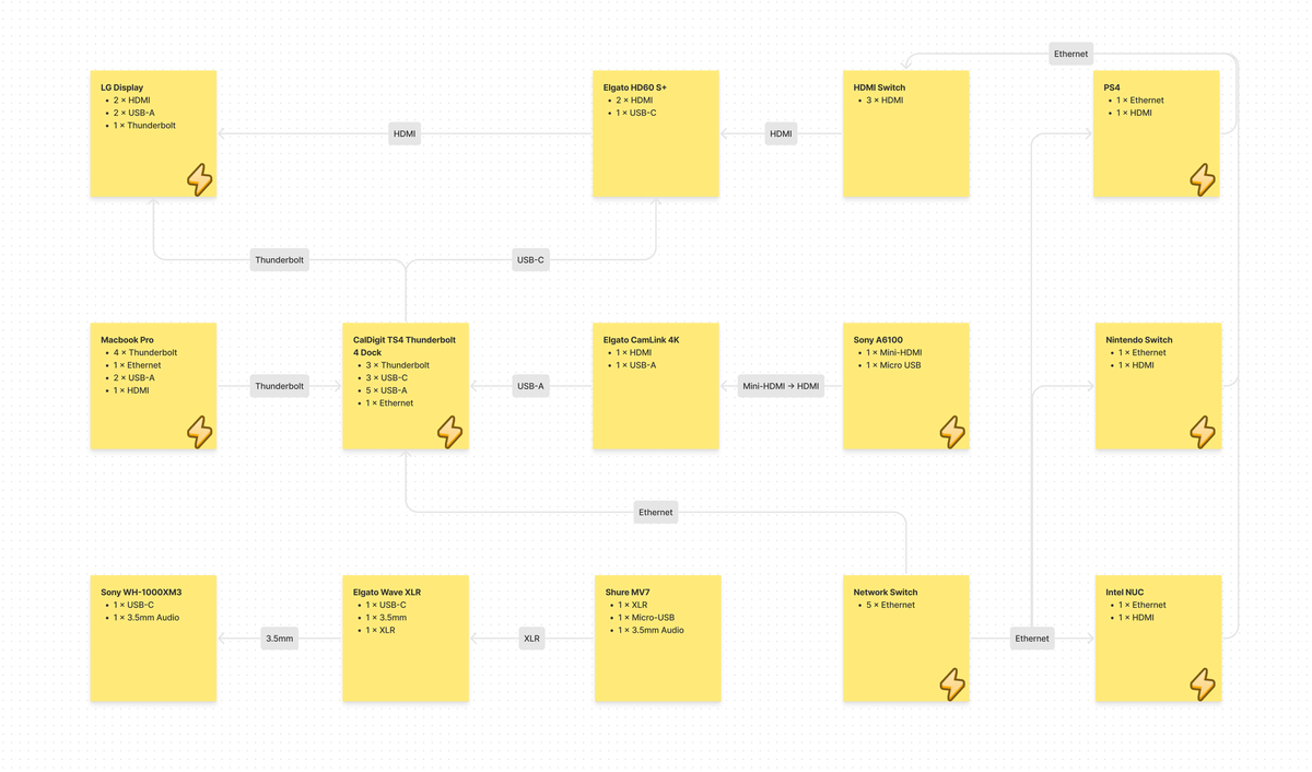I’ve routed all the cables to a CalDigit Thunderbolt 4 Dock, which can pass everything to the laptop over a single Thunderbolt 4 cable. I planned out all the adapters, cables, and power requirements with FigJam.
