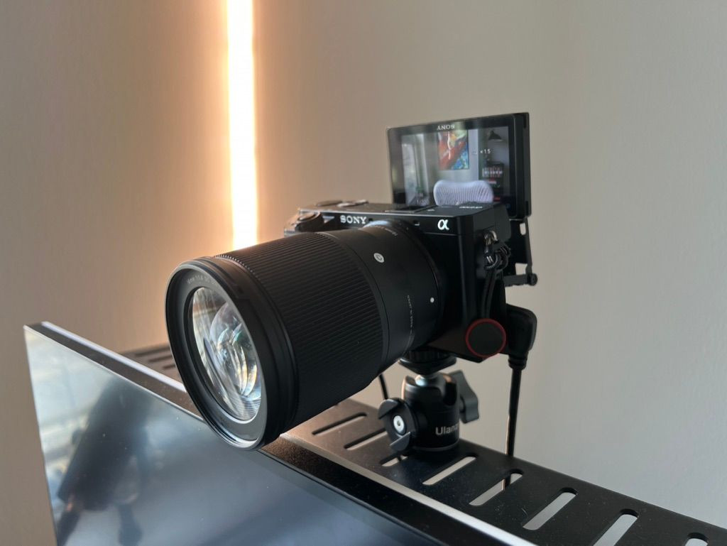 After years of waffling back and forth, I finally took the plunge and upgraded my webcam setup to a Sony Alpha 6100 with the Sigma 16mm f/1.4 lens mounted on a Heckler Camera Shelf. It's connected via an angled micro-HDMI connector and an Elgato Cam Link 4K.
