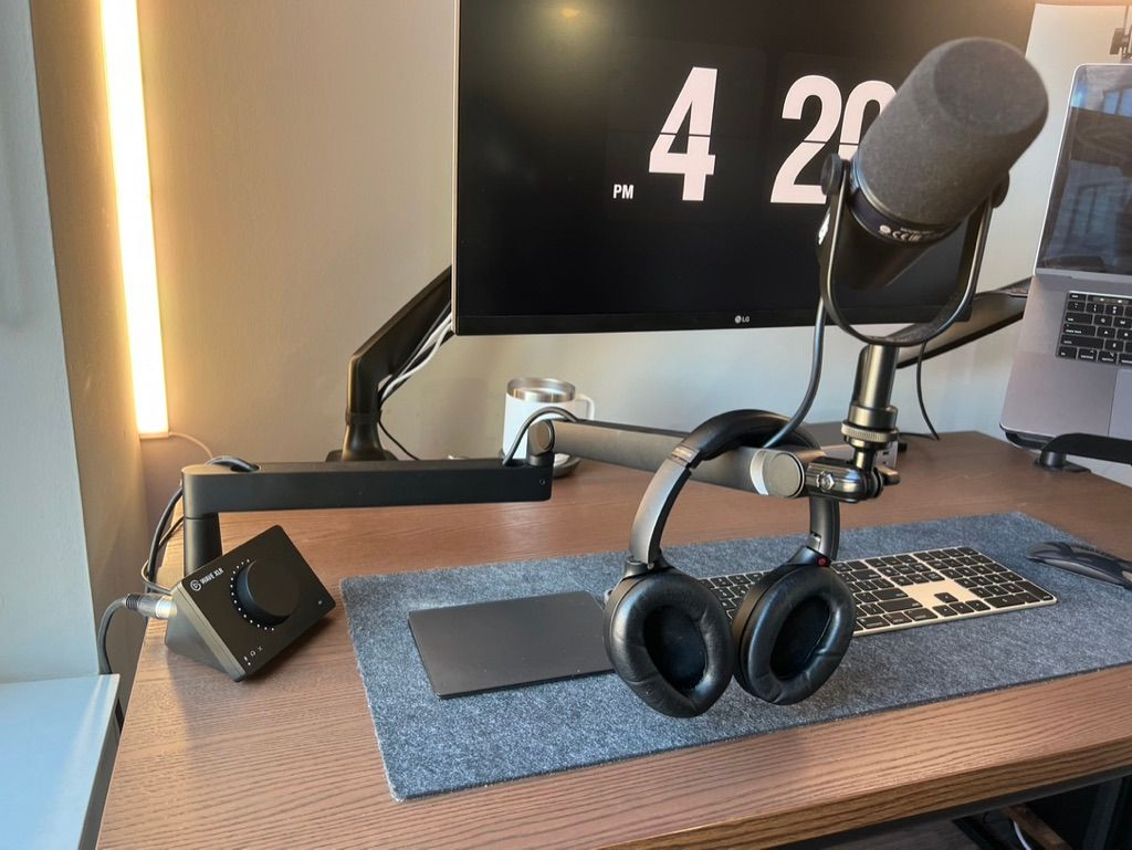I use a Shure MV7 mounted on a low-profile Elgato Mic Arm. I use an Elgato Wave XLR interface plugged into Sony Headphones to monitor my input without the annoyance of audio delay.
