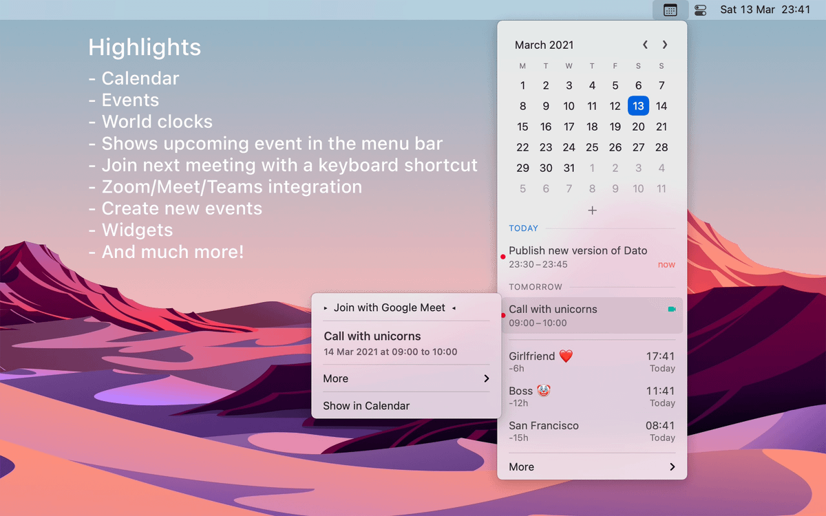 Working remote means I need easy access to Zoom links without opening my calendar. There's many good options in this category, including @MeetingBarApp, but my recommendation is @sindresorhus’s Dato