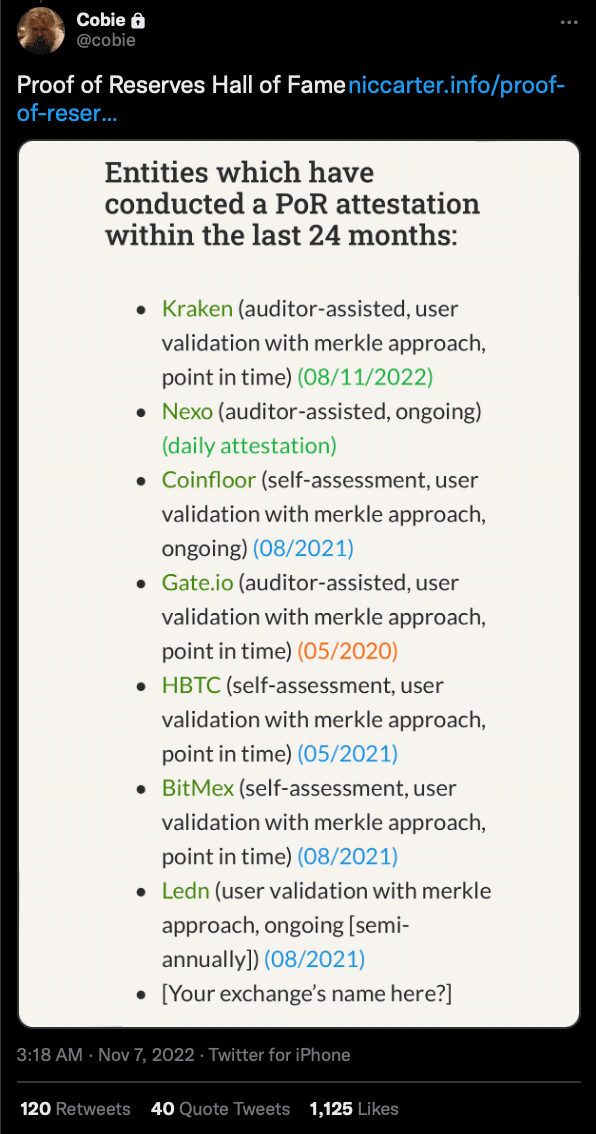 Many exchanges are now publicly disclosing addresses in an attempt for Proof of Reserves. The shortfall is it only shows one side of the equation: the assets, omitting whether those assets exceed liabilities. Nexo is among the very few to show this: