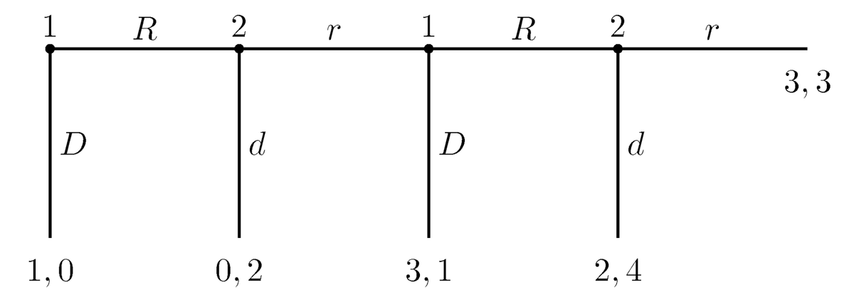 כדי להבין את הבעיה נסתכל על הדוגמא של "משחק מרבה הרגליים"[1]: בכל תור אחד משני השחקנים צריך להחליט אם לעצור את המשחק או להעביר את התור לשחקן הבא. בואו נבצע אינדוקציה לאחור: בשלב האחרון שחקן 2 צריך לבחור אם לשחק r ולקבל 3, או לשחק d ולקבל 4, והוא כמובן יבחר בd.>