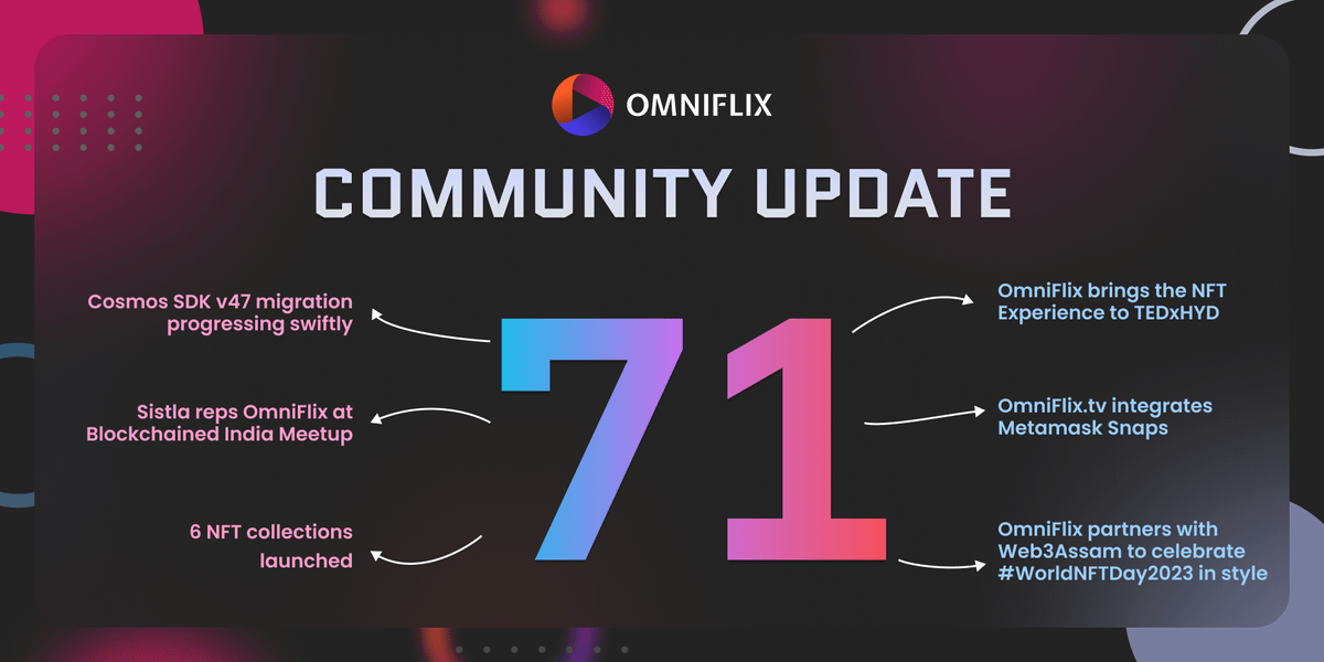 That's Community Update #71 wrapped! 🎬 Dive into the Flixverse now at OmniFlix.tv. Join the Flix Fam on: Blog (Mirror) : mirror.xyz/OmniFlixNetwork.eth Reddit : reddit.com/r/OmniFlix Discord : discord.com/invite/6gdQ4yZSTC Telegram : t.me/OmniFlixNetwork
